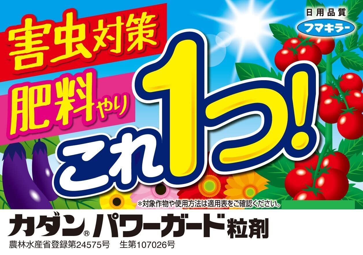・葉に付く虫・土に潜む虫を退治 土にまいたり混ぜるだけで、害虫の駆除・予防ができる「カダンパワーガード粒剤」。根から吸収された殺虫成分が作物のすみずみまで行き渡るため、葉・茎などに付く害虫や土に潜む害虫から作物全体を守ることができます。 ・殺虫効果が1.5ヶ月持続 使用後しばらく殺虫効果が持続し、1.5ヶ月間害虫を予防します。(なす、きくのアブラムシに対する殺虫効果。気象条件等により、効果の期間は異なります。 ・肥料成分配合で栄養補給も バランスの良い肥料成分が植え付け直後の苗の生育をサポート。害虫の退治と旋肥が同時に出来るので、園芸初心者にもオススメです。 ・イヤなニオイがしない 有機リン系殺虫剤不使用でイヤなニオイがしないので、室内やベランダ等でも気兼ねなく使えます。