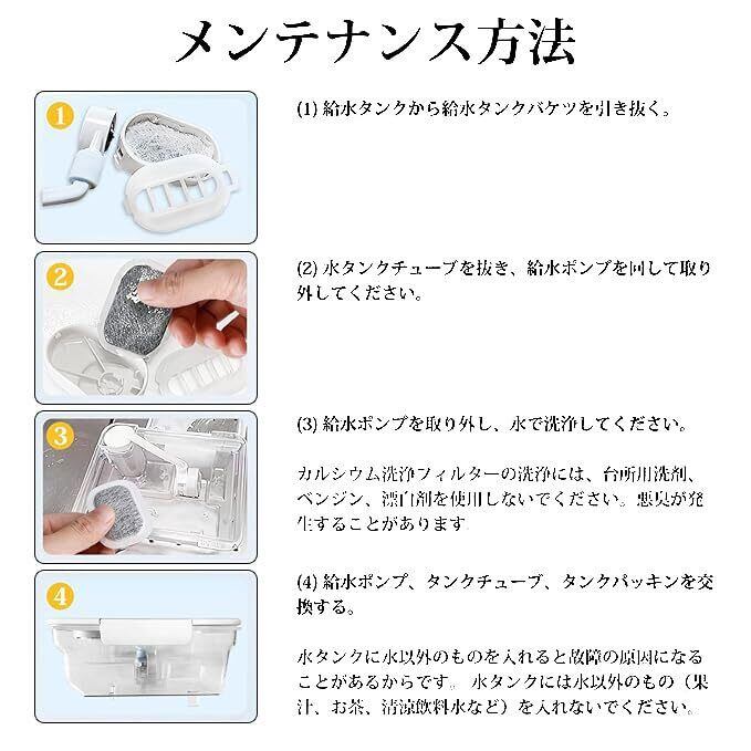 【お手入れの目安】:1週間に1回のお手入れが必要です。水の種類によってはカビが発生する恐れがある場合は、週に2~3回掃除してください。浄水フィルターに水垢が詰まると製氷できなくなる場合があります。