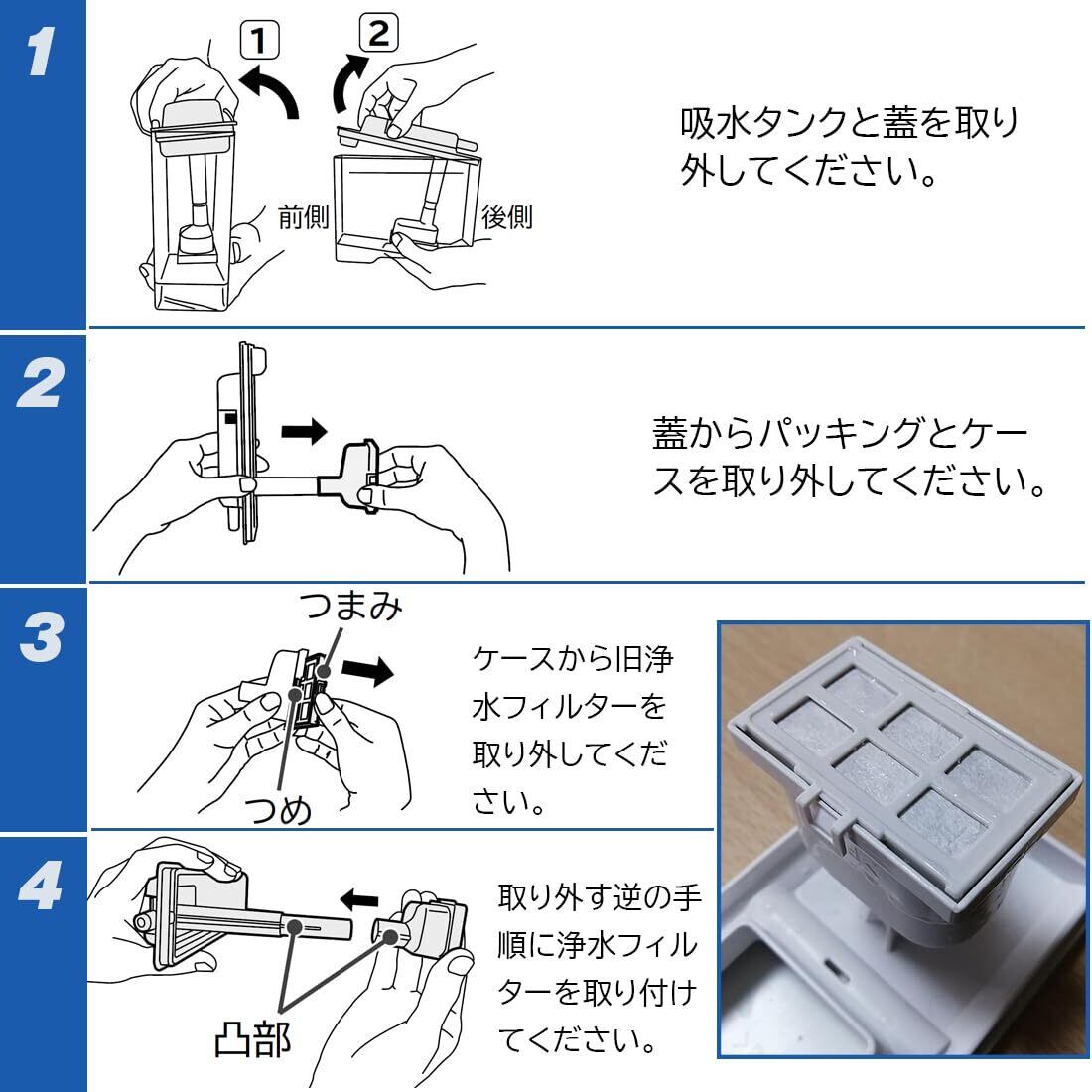 【交換の目安】水道水を使う場合は、浄水フィルターのお手入れ時期は3~4年間一回でお勧めします。臭みが生じたり、表面にゴミが付着して斑点ができたりしたときは交換してください。