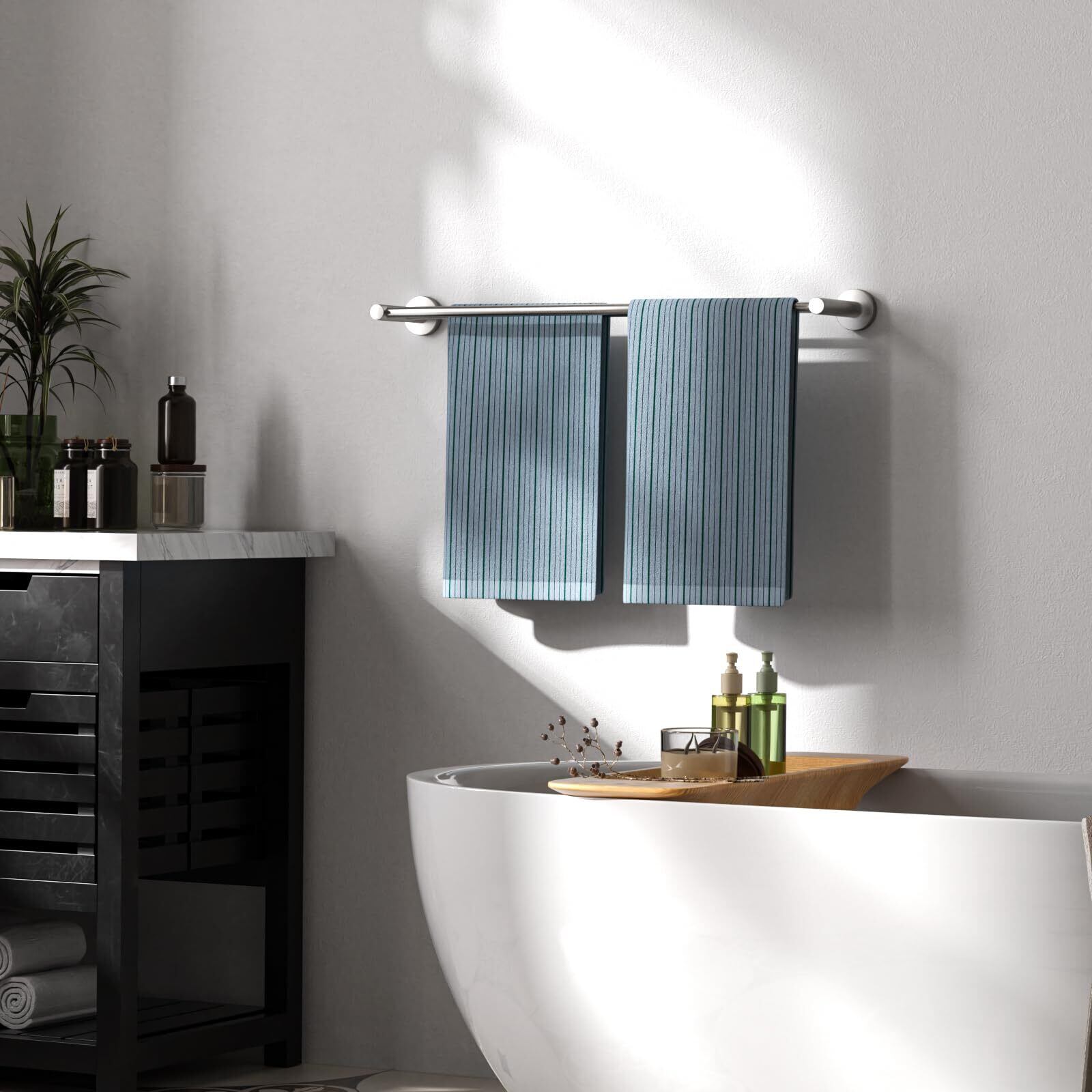 調節可能なダブルタオルレール - BLYLUNDのタオルホルダーは、ブラッシュドニッケル仕上げで、モダンなダブルタオルレールデザイン。タオルを掛ける長さをお好みに合わせてお選びいただけます。厚手のタオルを2枚同時に掛けられるので、空気が通りタオルが早く乾きます