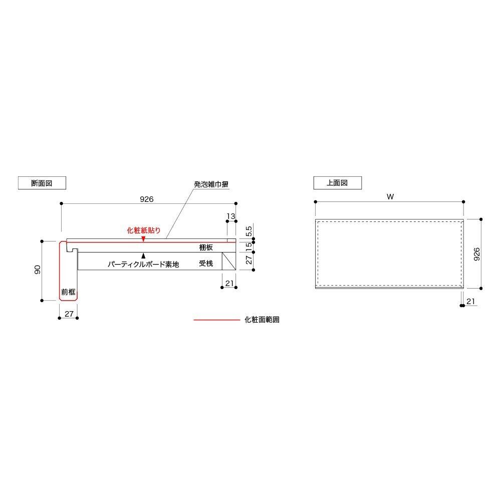 仕様 : 棚板 : パーティクルボード、上面=特殊硬化コート紙(EBコート仕様)、下面=パーティクルボード素地/前框 : 集成材、LVL、特殊加工化粧紙/受桟 : MDF素地/雑巾摺 : 発泡樹脂