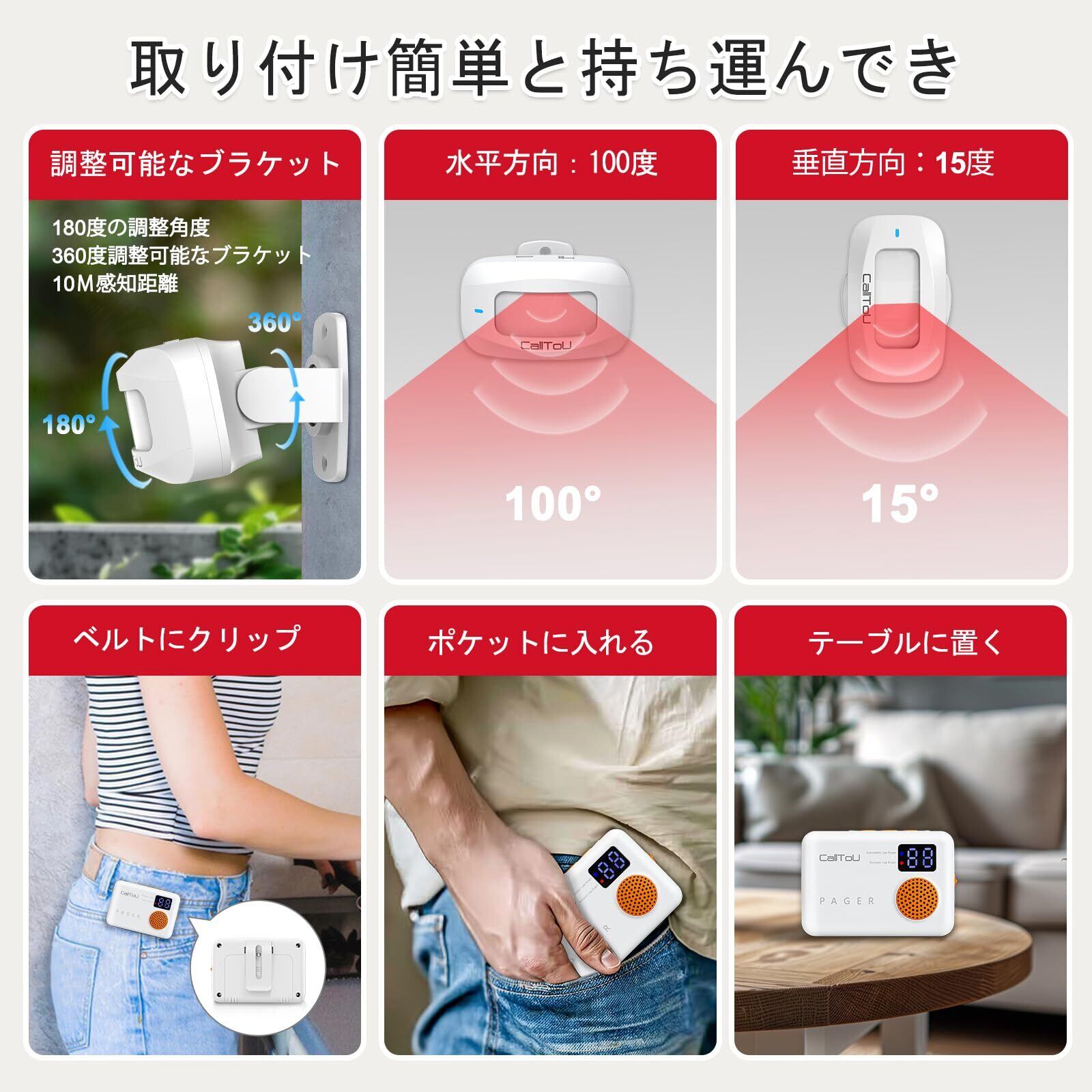 CallToU ワイヤレスチャイム 人感センサー 玄関チャイム 徘徊センサー 呼び出しベル 介護 家庭用 電池式 配線工事不要 動体検知 携帯しやすい 5段階音量調節 150M受信 高齢者 お年寄り 患者 妊婦 受信機*1 送信センサー*2