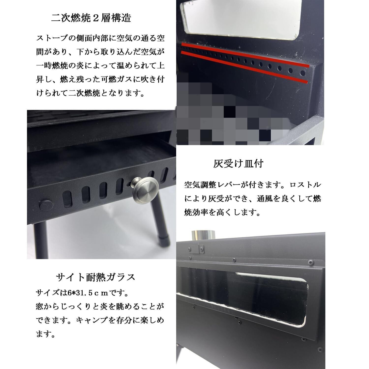 Solotour テント用 キャンプストーブ【二次燃焼 薪ストーブ 】 三面耐熱ガラス アウトド ポータブル ストーブ アスパークアレスター ダンパー付煙突*収納バッグ付き サイズ