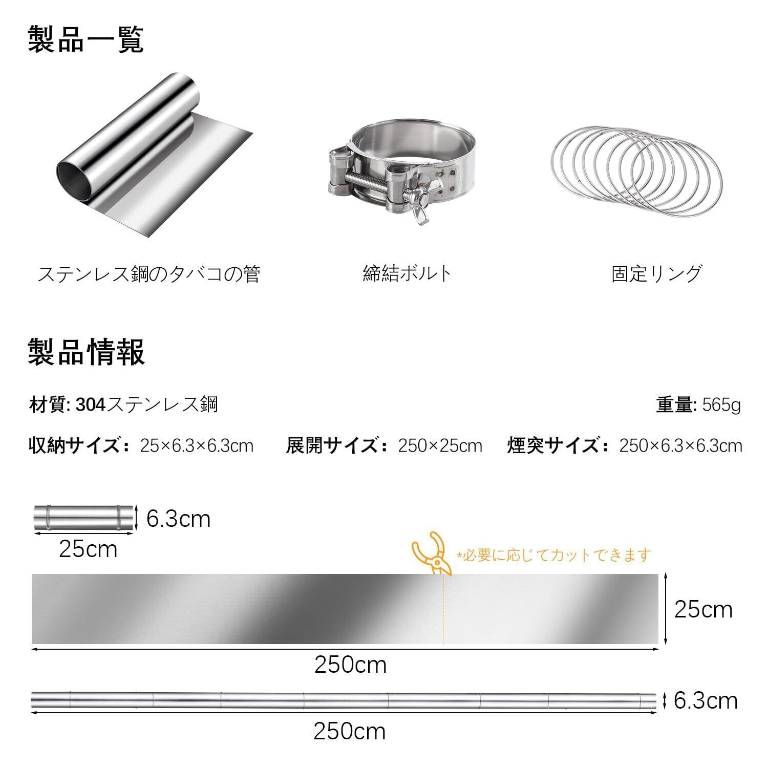 【サイズ】長:2.5m、幅:25cm、重量:0.6kg、直径約6.2~6.3cmのリングを使うと煙突直径6cmのストーブの外側にフィットします。欲しいサイズに簡単に切り離すことができ。