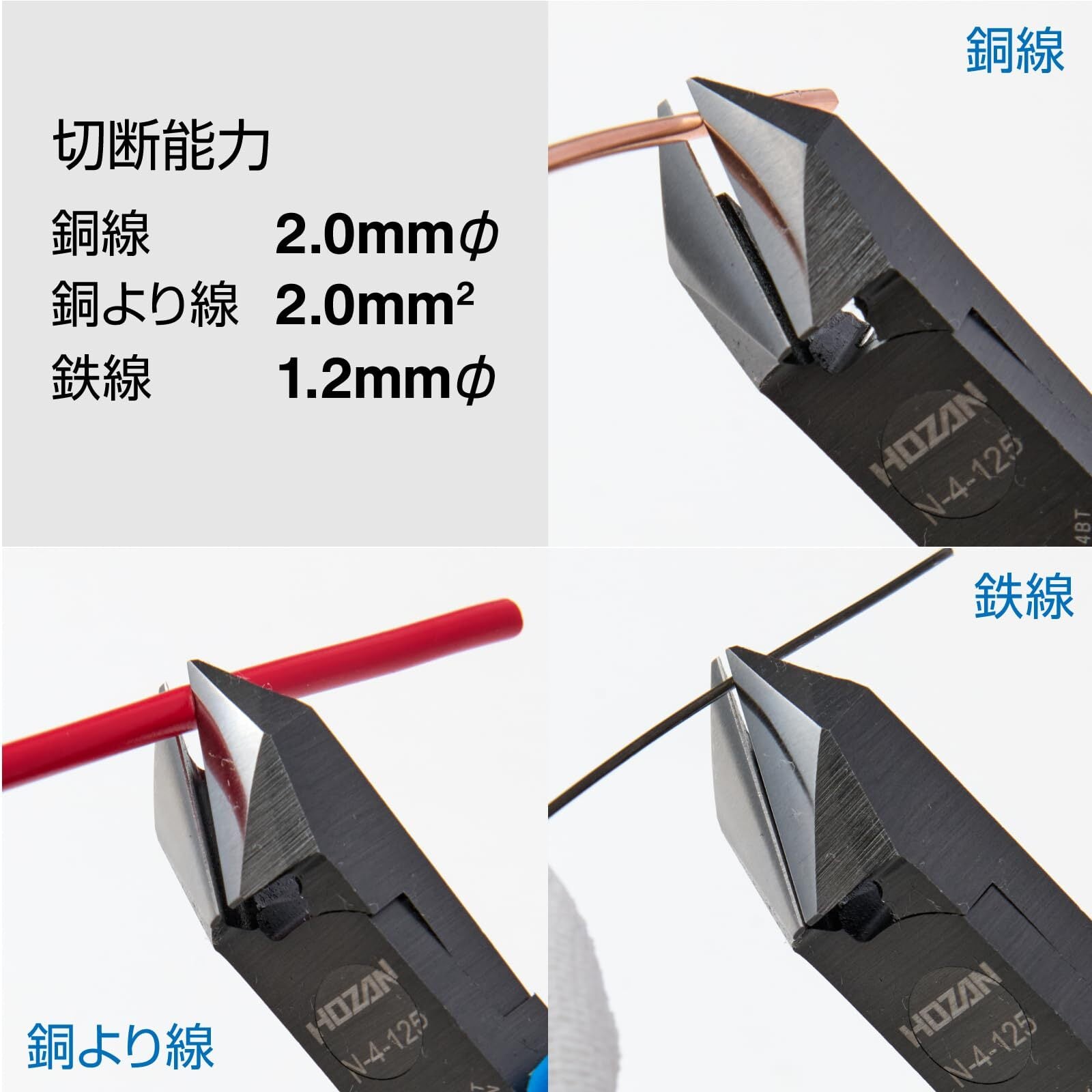 切断能力は銅線2.0mmφ、銅より線2.0mm^2、鉄線1.2mmφ。銅線切断に適した斜ニッパーです。