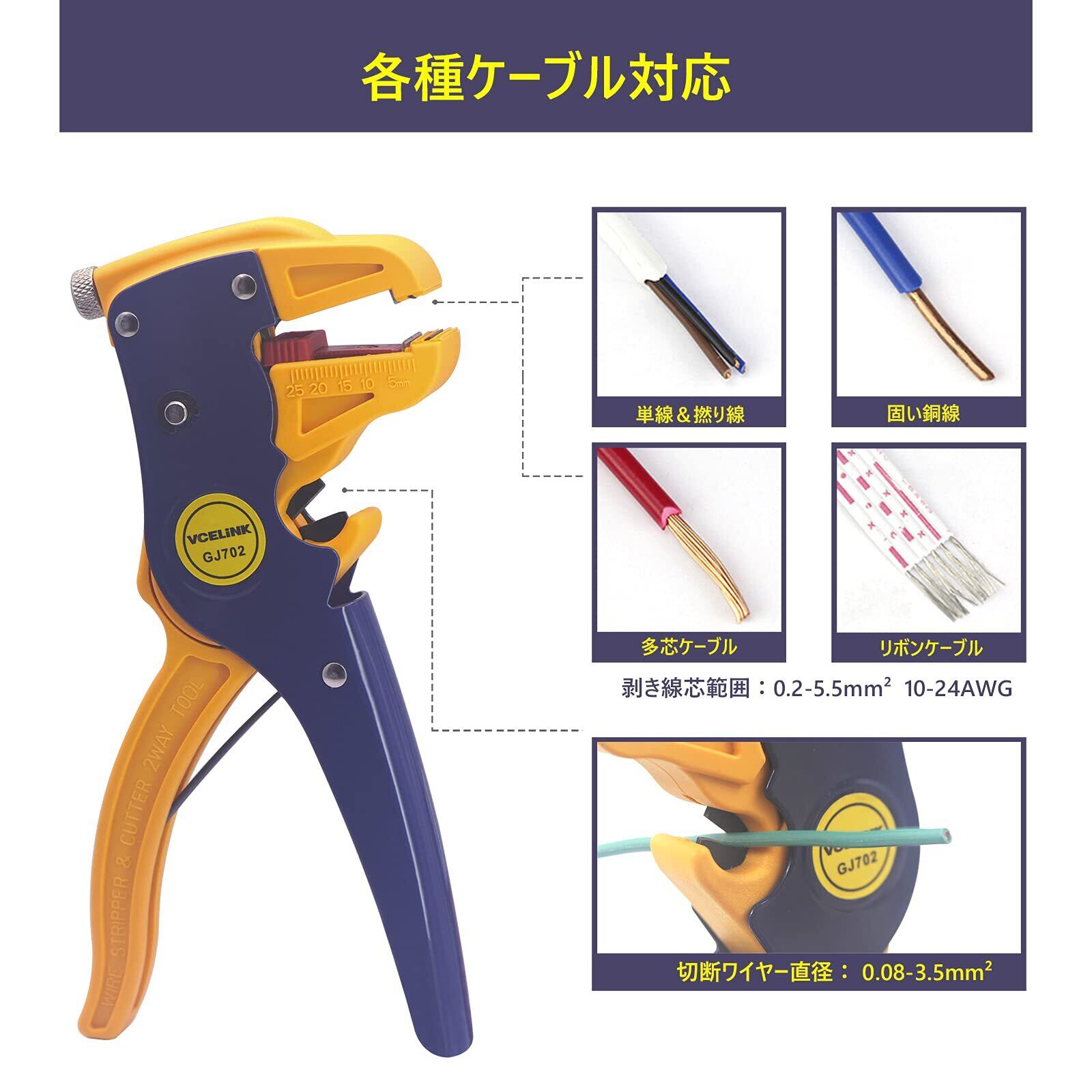 適用ケーブル: 単線、撚り線、多芯銅線、絶縁線、スピーカーケーブル等。ニッパーで皮膜を破くストレスから解放され、皮剥きが楽になり、ケーブル作成が楽になる。自宅DIY、初心者、電工、電気技師、電気系作業誰でも便利に利用できる。