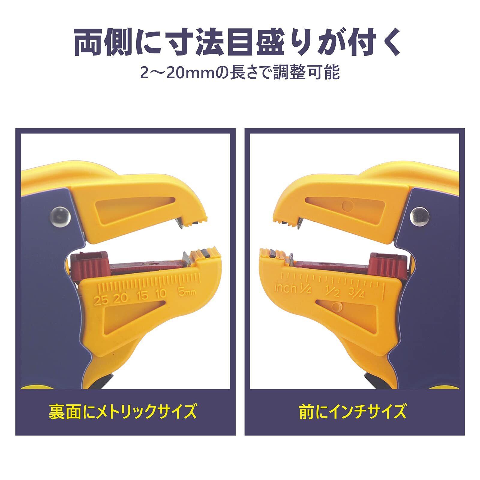 寸法調整可能:調整できる刃の隙間、被服を剥く寸法も調整出来る。刃の○穴に合わせる必要は無く、どんどん剥ける。剥く部に線の長さを示す目盛りが付き、被膜剥ける長さを制御できる。
