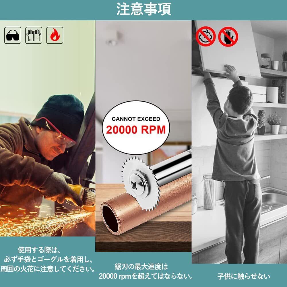 【注意事項】1.使用する際は、必ず手袋とゴーグルを着用し、周囲の火花に注意してください。2.このスリッターブレードを使う時は回転速度が遅くなって、ロッドを最後まで持たねばなりません。鋸刃の最大速度は20000 rpmを超えてはならない。