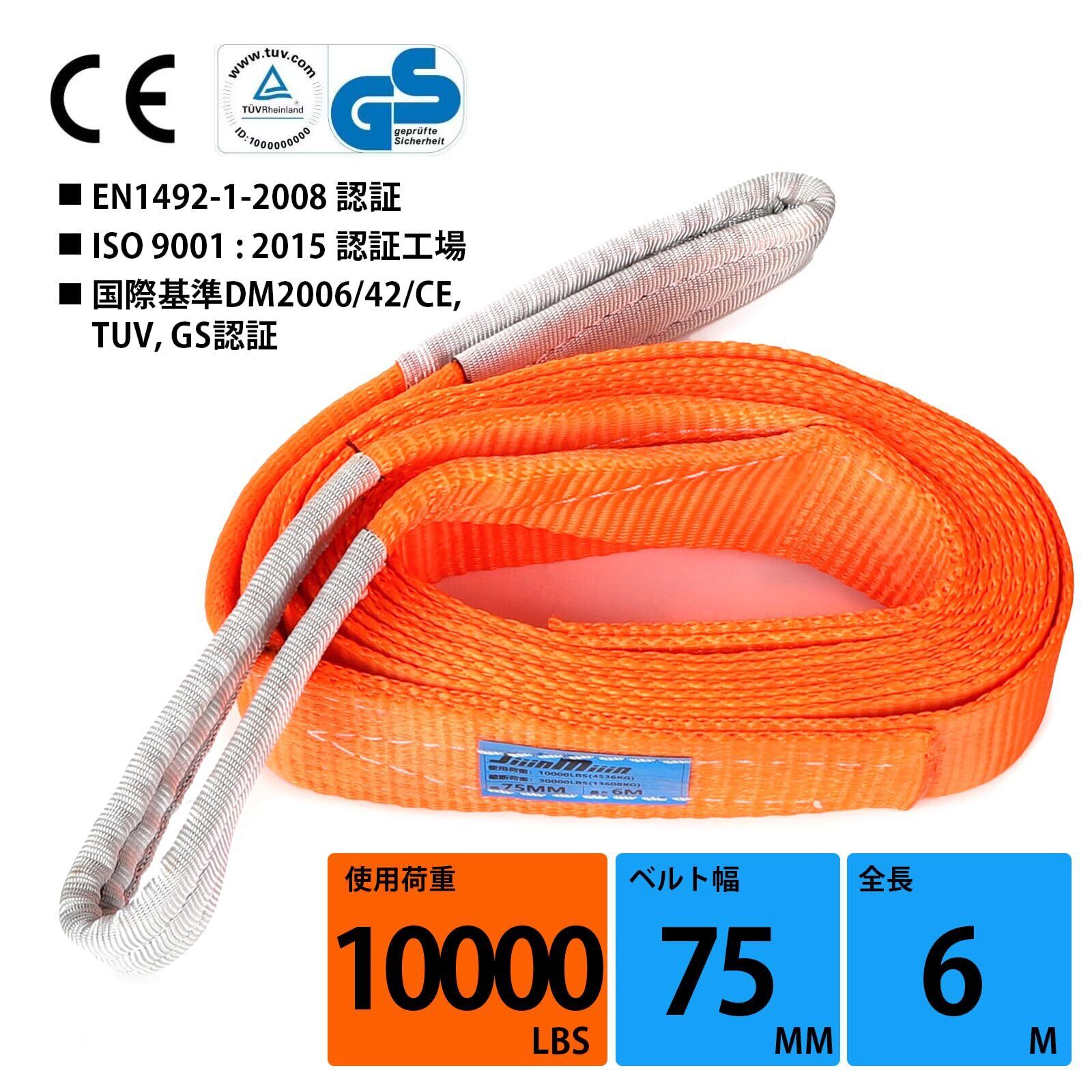 【商品仕様】■全長:6m ■ベルト幅:75mm ■オレンジ 最大使用荷重:10000LBS(4536KG) (ストレート吊の場合) ■安全係数:3
