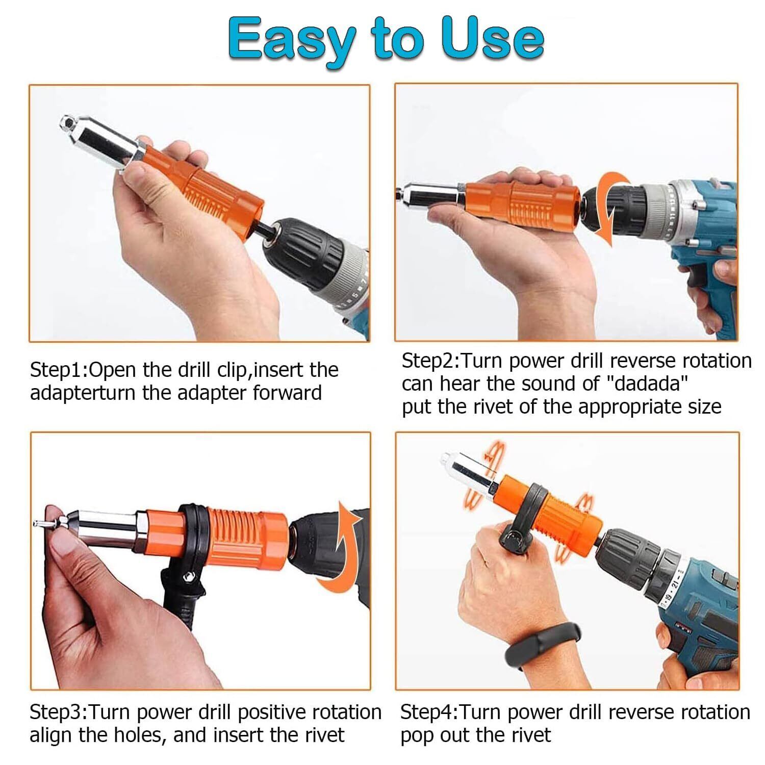 使いやすい:リベットがスナップしたら、ドリルを正の回転にポップし、ドリルを逆にして引き抜いた後にリベットを簡単に落とします。 ドリルを前方にスナップし、別のリベットをロードして繰り返します。