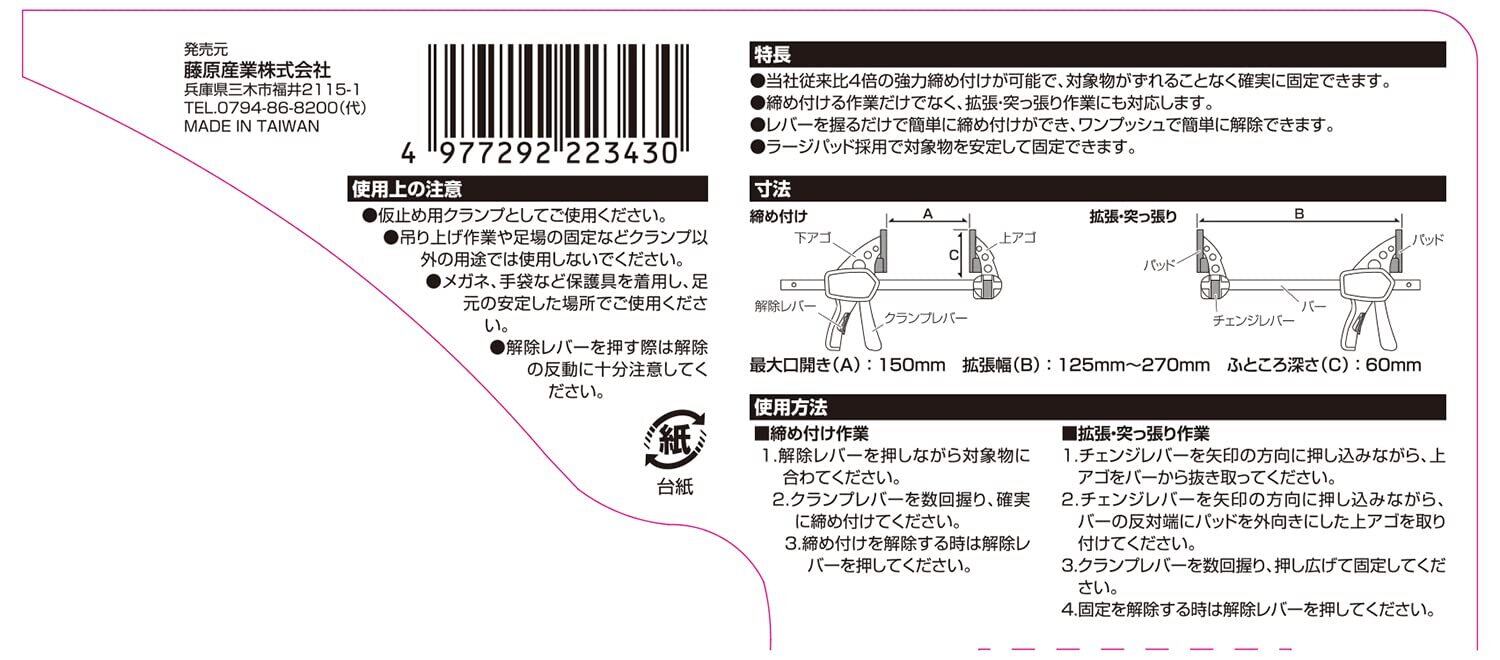 レバーを握るだけで強力クランプ、ワンプッシュで簡単にリリースできる【用途】木工作業等の仮止め作業【特徴】・小さくても強力な締付力を発揮・締め付ける作業だけでなく、拡張・突っ張り作業にも対応・ラージパッド採用で対象物を安定して固定できる・最大締付力は80kg(当社従来品の約4倍)【注意事項】※仮止め用クランプとしてご使用下さい。※つり上げ作業や足場の固定などクランプ以外の用途では使用しないで下さい。※メガネ、手袋など保護具を着用し、足元の安定した場所でご使用下さい。※解除レバーを押す際は、解除の反動に十分注意して下さい。
