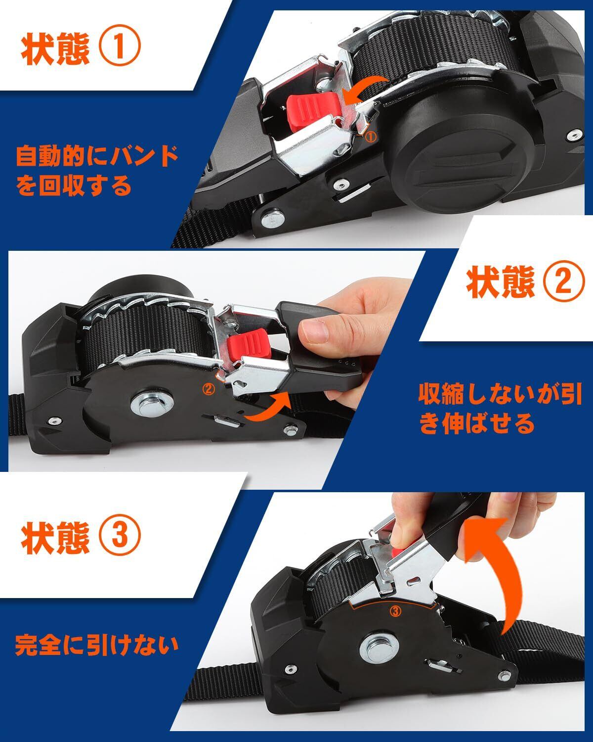 JiiinMiiin 自動巻き取り式 ラチェットベルト 荷締めベルト 長さ3M 幅2.5CM 2本セット GS認証 多用途 引越し 運搬用