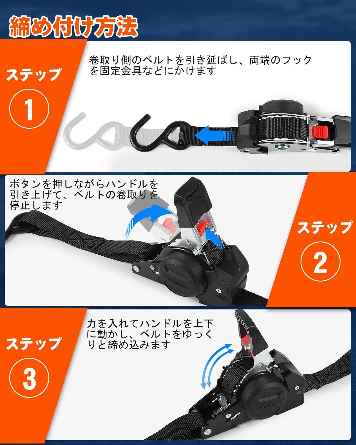 【ラチェット機能】荷締めベルトはラチェット機能付を搭載し、荷物をしっかり締め付けます。引き出すだけで長さを調節可能で、荷締め作業がスムーズかつ簡単です。