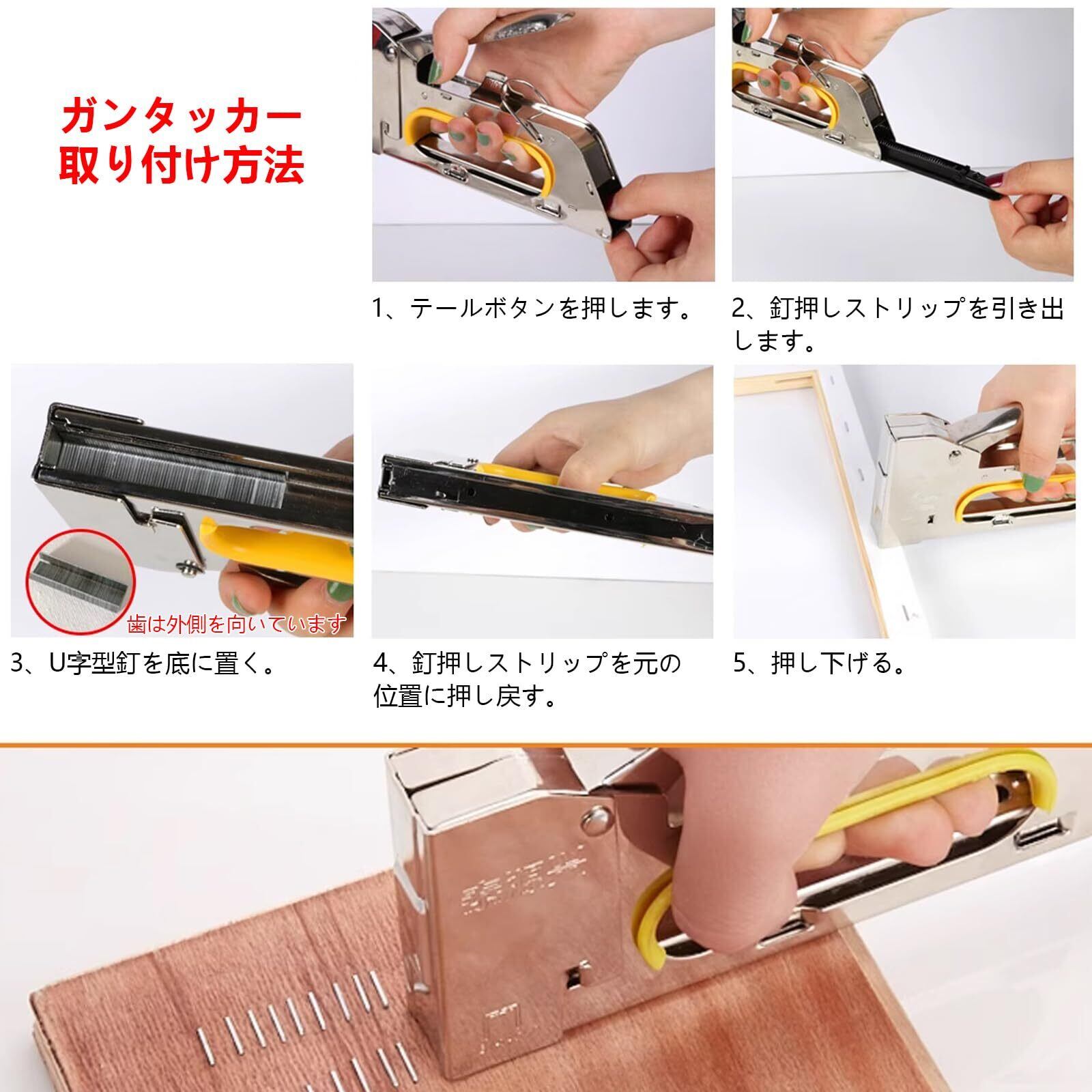 【手動ステープルガンの特徴】ステープルガンは高品質の鋼材で作られ、丈夫で耐久性があり、使用する時、便利で省力化され、操作が簡単で、繰り返し押しても破損しにくく、DIY油絵のフレーム、大工、建築、ソファ、ベッドなどの修理に使用できます。