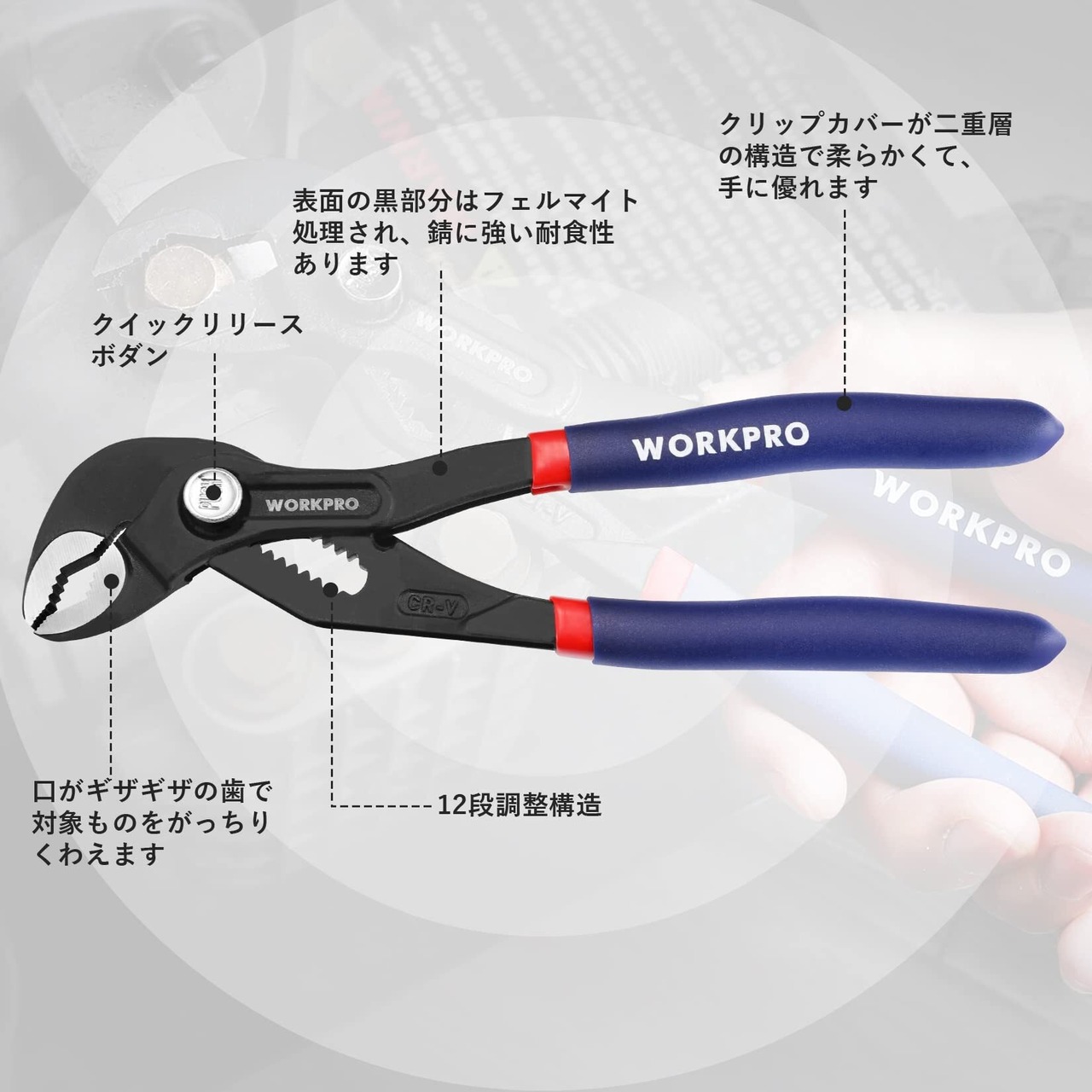 WORKPRO ウォータポンププライヤー 12段調整構造 全長180mm クイックリリース調整タイプ