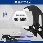 【商品仕様】全長:180mm。最大口開き:40mm。重量:240g。プライヤーとレンチツール機能を兼ね備えたプライヤーレンチです。