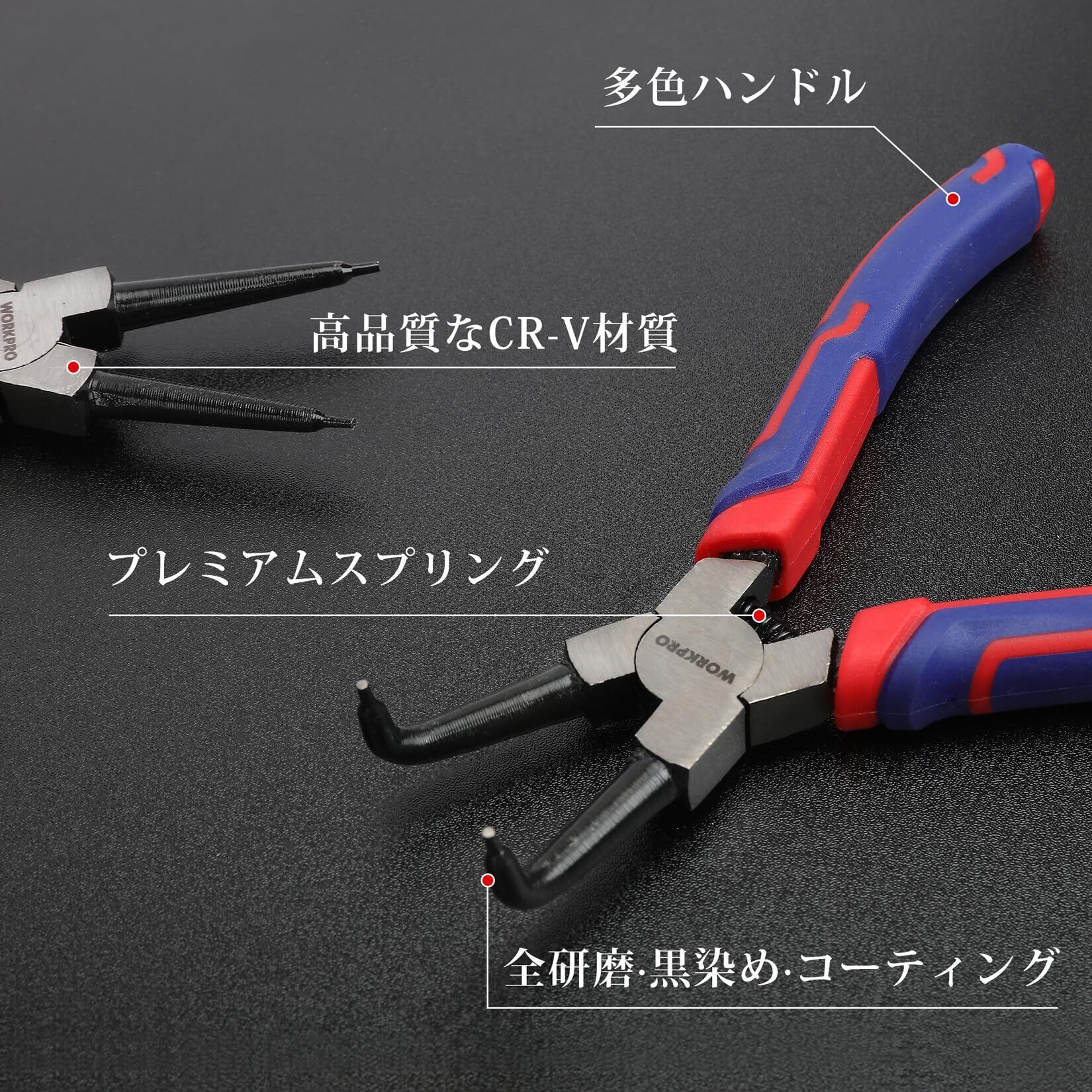 WORKPRO スナップリングプライヤー 4本組 穴用 軸用 直爪 曲爪 Cr-V材質 錆びにくい C型リングの着脱 バネ付き 工具 作業 修理 全長180mm 収納袋付き