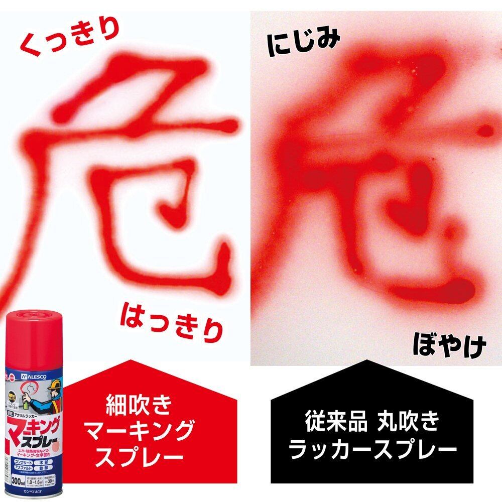 【特長】 ■[マーキング等に特化したスプレー]プロ向け商品。細吹き丸型ノズルで、マーキング・文字書きに最適。【用途】 ■建築・工事現場でのマーキング・文字書きに 工事現場 : 建築 / 土木 / 配管 / 電気 / 通信 / 鉄道 など その他:林業 / 造船 / 鉄工業 など ■素材 コンクリート / アスファルト / 鉄部 / 木部 などに ※ コンクリート・アスファルトに塗装後、長時間放置すると変色や剥離する場合があります。ご注意下さい。 【塗れないもの・注意事項】表示の用途以外には使用しないでください。 ■[吸い込みの大きい素材]MDF板 など ■[各種素材]アルミ / ステンレス / プラスチック / 発泡スチロール / ガラス / 皮製品 など ■[高温部]熱い物を置くテーブル / ストーブ など ■[常に水がかかる所]浴室 など ■[その他]高級家具 / 自動車 / 床面 / 食器類 など【乾燥・塗重時間】 【20℃】乾燥時間:約 30 分 塗重時間:約 1 時間以上 【冬期】乾燥時間:約 1 時間 塗重時間:約 2 時間以上 【塗り面積(1回塗)】平方メートル:約 1 ~ 1.6 m² タタミの広さ:約 0.8 枚分【塗装時の注意】 ■[使用前に良く振ってください]使用前に容器を良く振ると、カラカラと音がします。 その状態で約30秒以上続けてください。 ■[使用後は]噴出口が詰まらないように、容器を逆さにして2秒程度空吹きし、噴射口を良く拭いてから蓋をして下さい。 ■[塗装時は広がり易いので要注意]人、物、観賞魚、ペット類、食品等にかからないようにしてください。 ■[あらかじめ試し塗りを]噴射の状態、ノズルを動かす速さなど、あらかじめ試し塗りを行ってください。 ■[逆さにして使用しないで]逆さにした状態で吹き付けをしないで下さい。 ■[厚塗りはしないで]一度に厚塗りをせず、塗る面と平行に移動しながらペイントします。その際、やや薄めにまんべんなくを心がけて、2~3回程度塗り重ねてください。