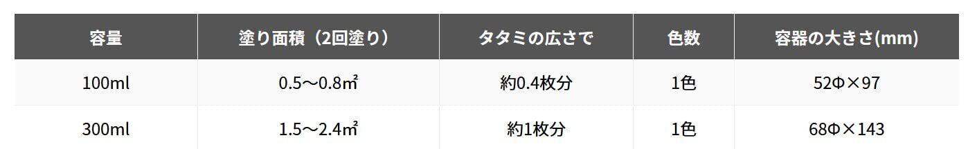 【乾燥・塗重時間】【20℃】乾燥時間:約 20 分 塗重時間:約 1 時間以上 【冬期】乾燥時間:約 40 分 塗重時間:約 2 時間以上 ■スプレー 【20℃】乾燥時間:約 10 分 塗重時間:約 30 分以上 【冬期】乾燥時間:約 30 分 塗重時間:約 1 時間以上 【塗り面積(2回塗り)】 100ml:平方メートル:約 0.5 ~ 0.8 m² タタミの広さ:約 0.4 枚分 300ml:平方メートル:約 1.5 ~ 2.4 m² タタミの広さ:約 1 枚分 スプレー300ml:平方メートル:約 0.8 ~ 1 m² タタミの広さ:約 0.6 枚分
