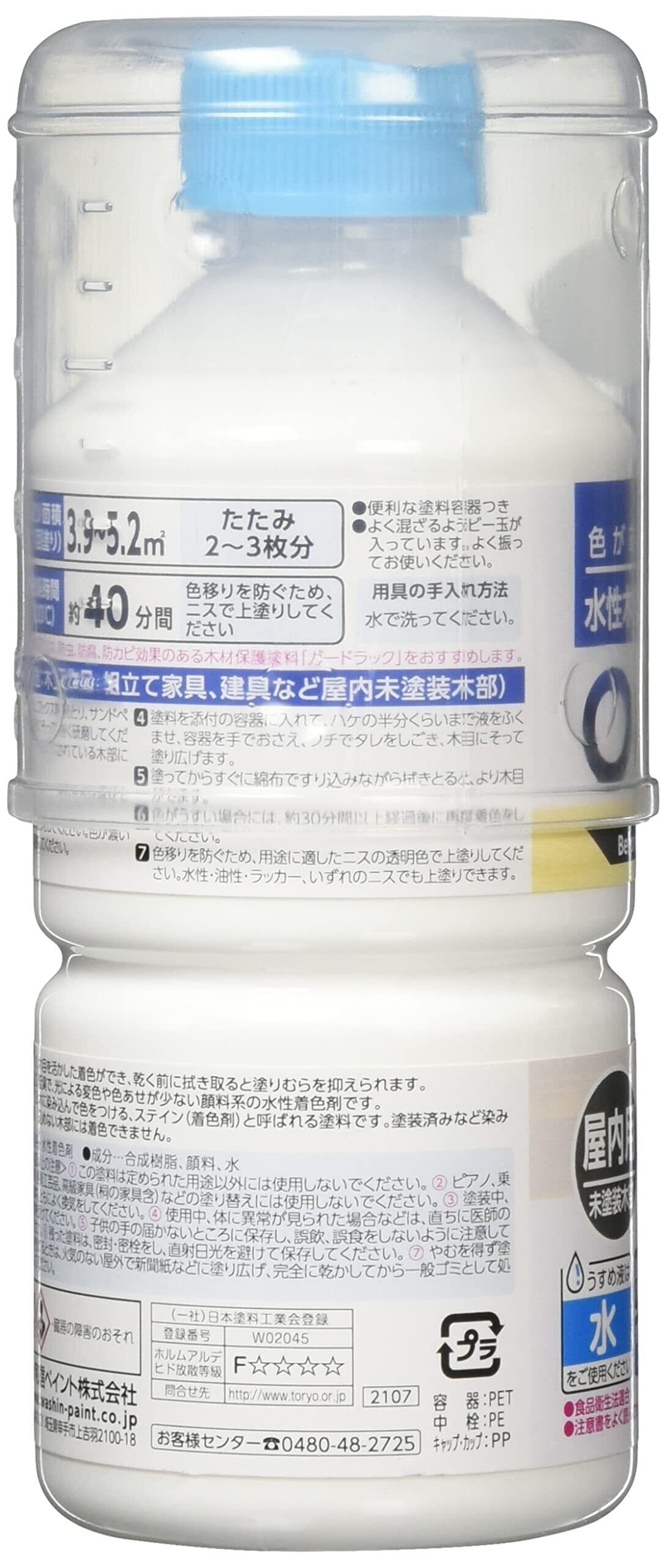 木の深みを引き出す水性顔料着色剤【用途】木工作品・木彫・家具・木の床・階段など、未塗装木部への着色【特徴】・木に色をつけるためのステインと呼ばれる塗料の一つ・油性オイルステインの仕上がりを、臭いの少ない水性で再現・色ムラになりにくく、木目を引き立てる・水性・油性・ラッカー、どのニスでも上塗りができる【注意事項】※との粉と混ぜると、着色と目止めが同時にできます。※色をつけるための塗料で、表面を保護する力はありませんので、必ずニスで上塗りしてください。※水性オイルステイン同士は、混ぜて使うことができます。