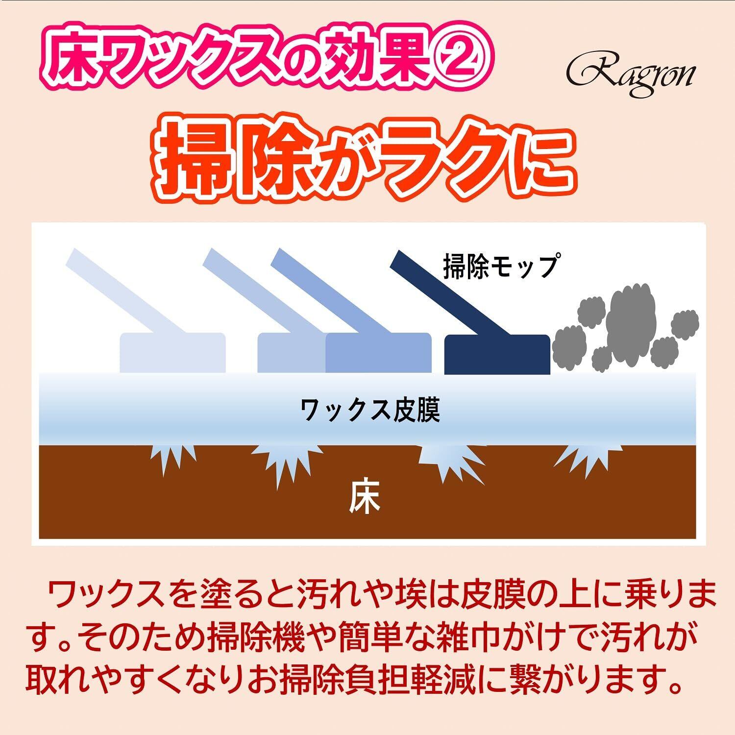 ツヤ持続期間:約6カ月(2回塗り)/床表面の保護効果:約1年(2回塗り)/標準塗布量:60畳分(1回塗り)/用途:フローリング、寄せ木、ニス塗り木材、Pタイル、クッションタイル/画像は、ワックスの塗布イメージです/塗布具はついておりません