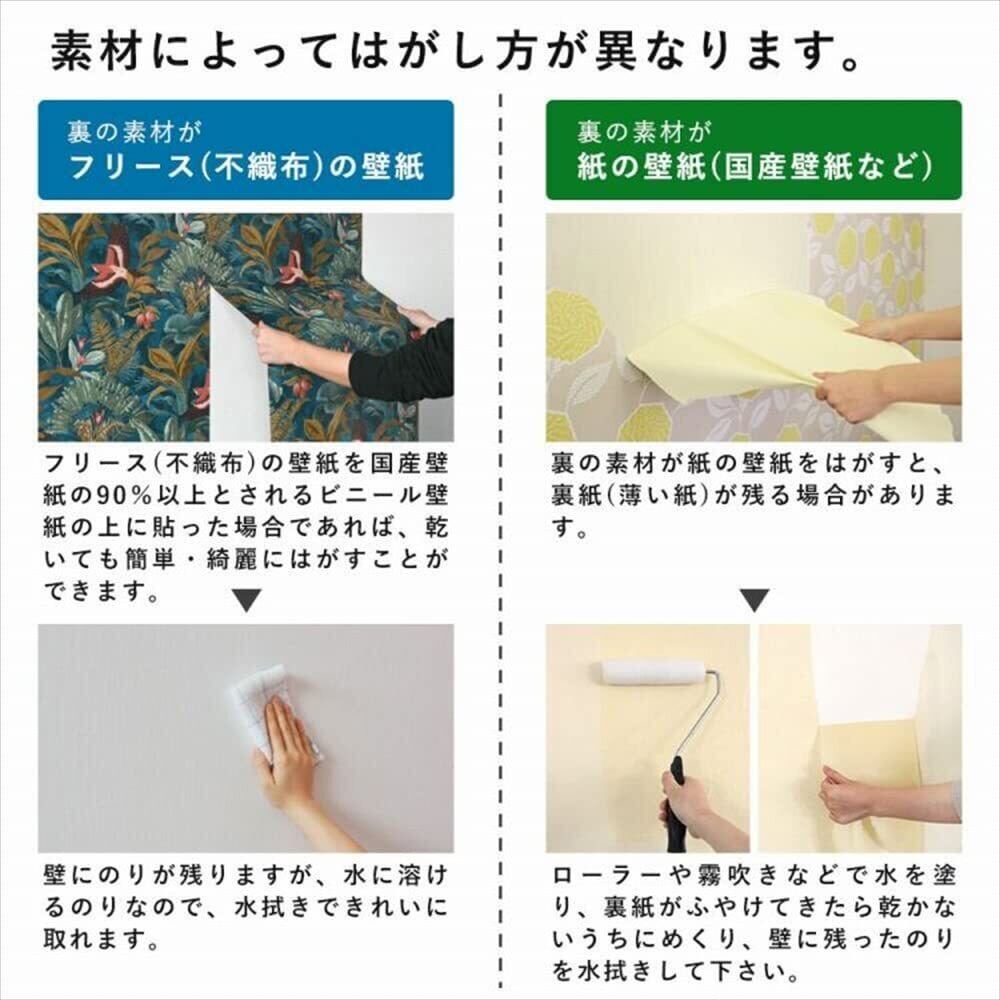フリース壁紙(不織布壁紙)や裏面が紙素材になっている多くの国内メーカーの壁紙にはがせる効果を発揮します。※目立たないところで少し試してから施工してください。