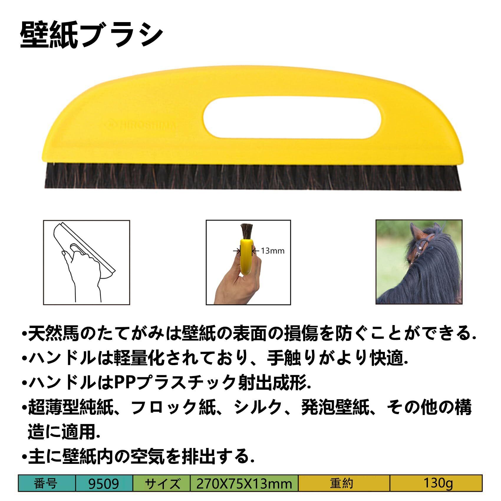 壁紙用ブラシ 壁紙ブラシ 軽量ニ行プラシ 刷毛 壁 ブラシ 壁紙 貼り 道具 壁紙貼り道具 PP+馬のたてがみ二行毛長16mm黄 (9509壁紙ブラシ 黄)