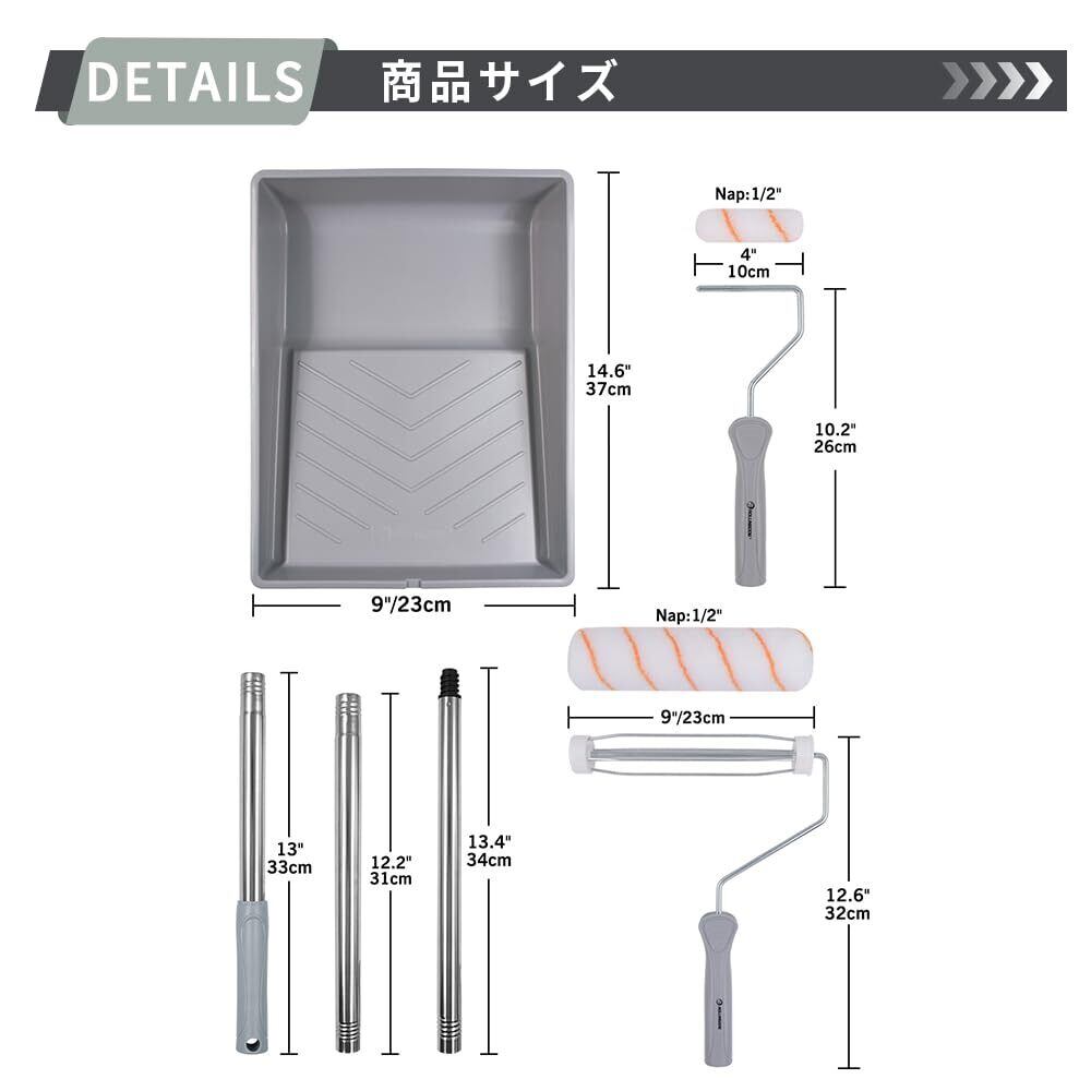 壁全体をムラなく塗装: 4インチミニローラーで縁やコンセント周りを塗装し、9インチ壁用ローラーと均一な仕上がりを実現。壁全体を滑らかに塗装できます。使用上の注意: より良い塗装効果を得るため、使用前にローラーカバーをきれいな水で洗い、乾いた布またはペーパータオルで拭いてください。