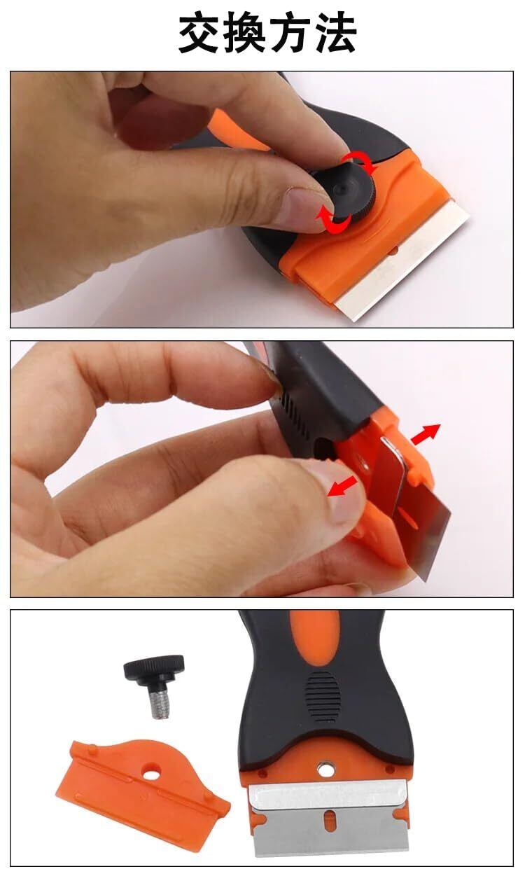【刃の交換方法】用途に応じて刃を交換することができます。ブレードの交換は簡単で、他の工具は必要ありません。1、スキージ固定ネジを外す。 2、ブレードカバーを外す。 3、ブレードを外す。3、ブレードを取り外します。4.ブレード交換後、ブレードカバーを戻し、ネジを締めて交換完了です。
