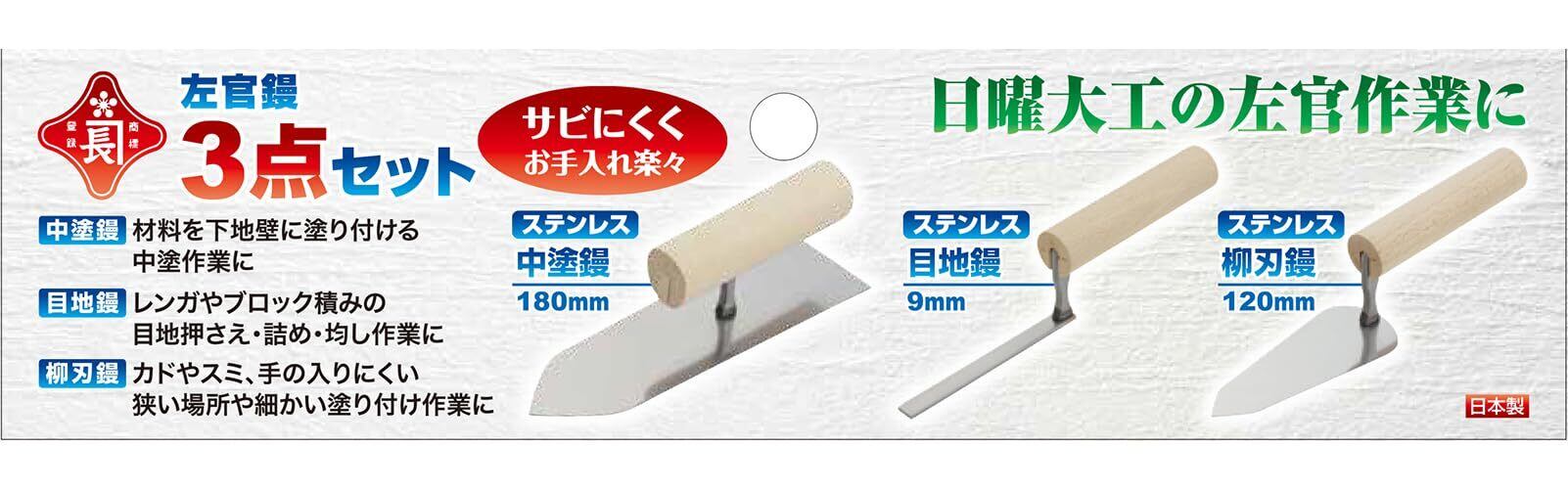 赤長(Akakanechou) 左官ごて 3点セット 中塗り180mm、柳刃105mm、目地コテ9mm