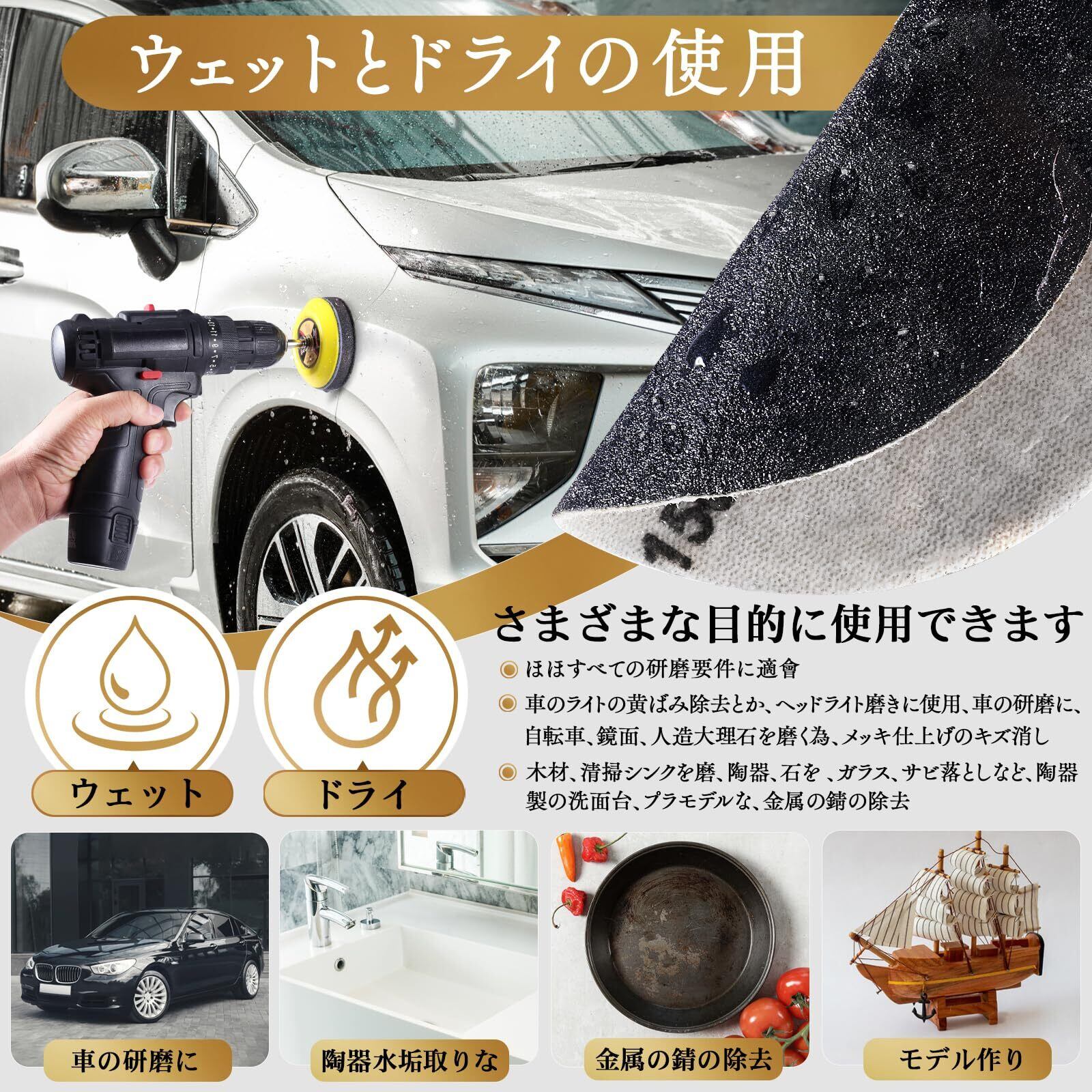 【幅広い使用用途】黄ばんだヘッドライトを修理するために利用しました、ヘッドライト磨きに使用、車のバンパーでパテ研磨、車の研磨に、自転車、鏡面、車&バイクのメンテナンス、木材や金属板で、金属の錆の除去、板金塗装、清掃シンクを磨、陶器、石を 、ガラス、木製家具の表面処理、木工用生地研磨、サビ落としなど、狭い範囲の磨きに便利です、陶器製の洗面台、プラモデルなどに