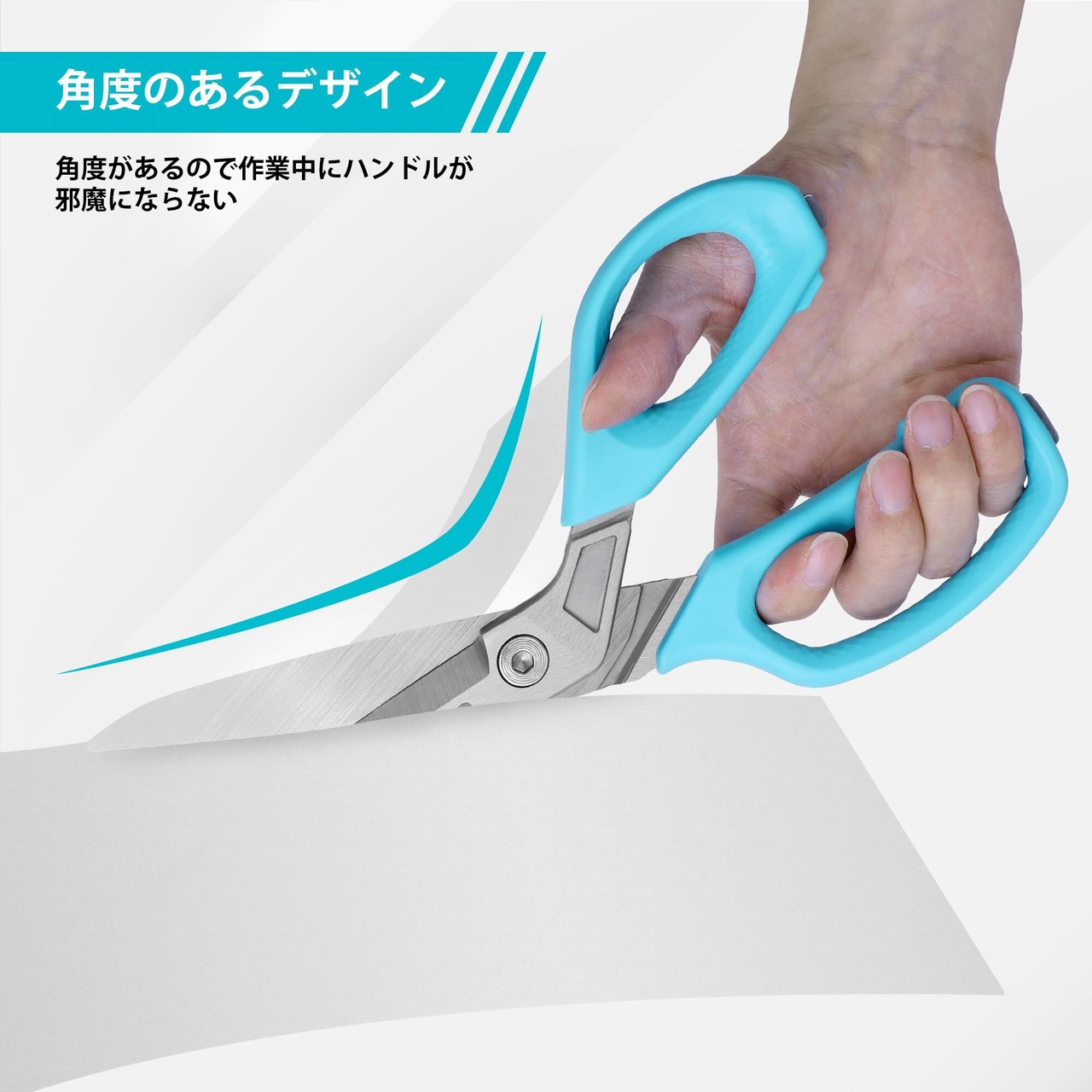 【布に引っかからないデザイン】ハンドルと刃の間にアングルがあるため、切るときにハンドルが対象物に引っかからずに進めます。切断作業がよりスムーズに進行します。