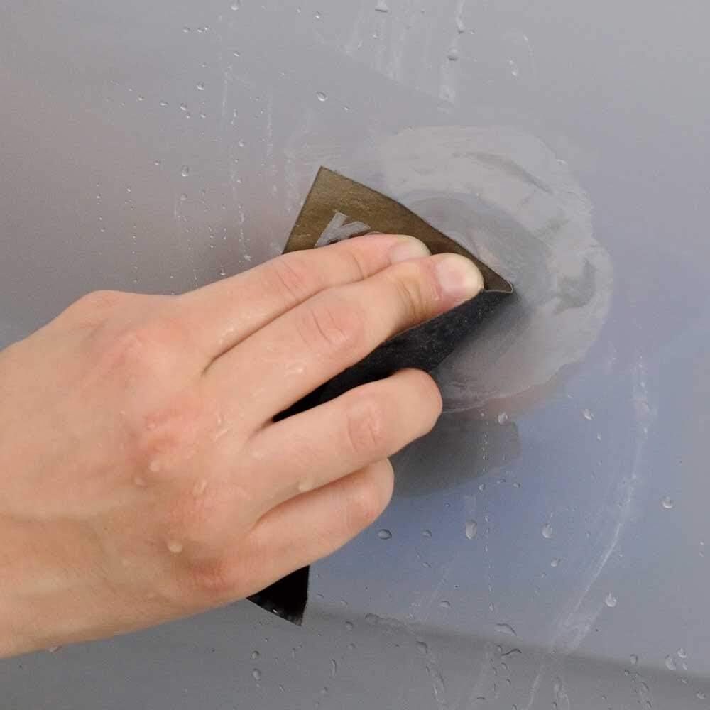 ペーパーの一ヶ所だけを使わず、均等に新しい面で研磨します。バケツを用意し、水をつけて使用します。力のいれすぎで削りすぎないようにしてください。
