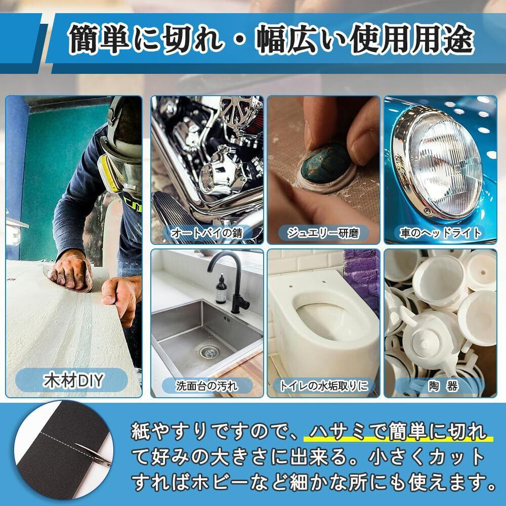 幅広い用途:サンドペーパー粗い番手から、細かい番手までセットになっており、サビ、腐食部分の研磨に最適です。バイクのメンテナンス、車のスプレー塗装前に使用、金属のヤスリをかけた後使用に、金属の錆の除去、水垢ペーパー、トイレの塊汚れに使うとピカピカになるよ。木材DIY、ガラス、鏡面、金属、陶器、木工から塗装面の磨きまでなんでも使えそうです!