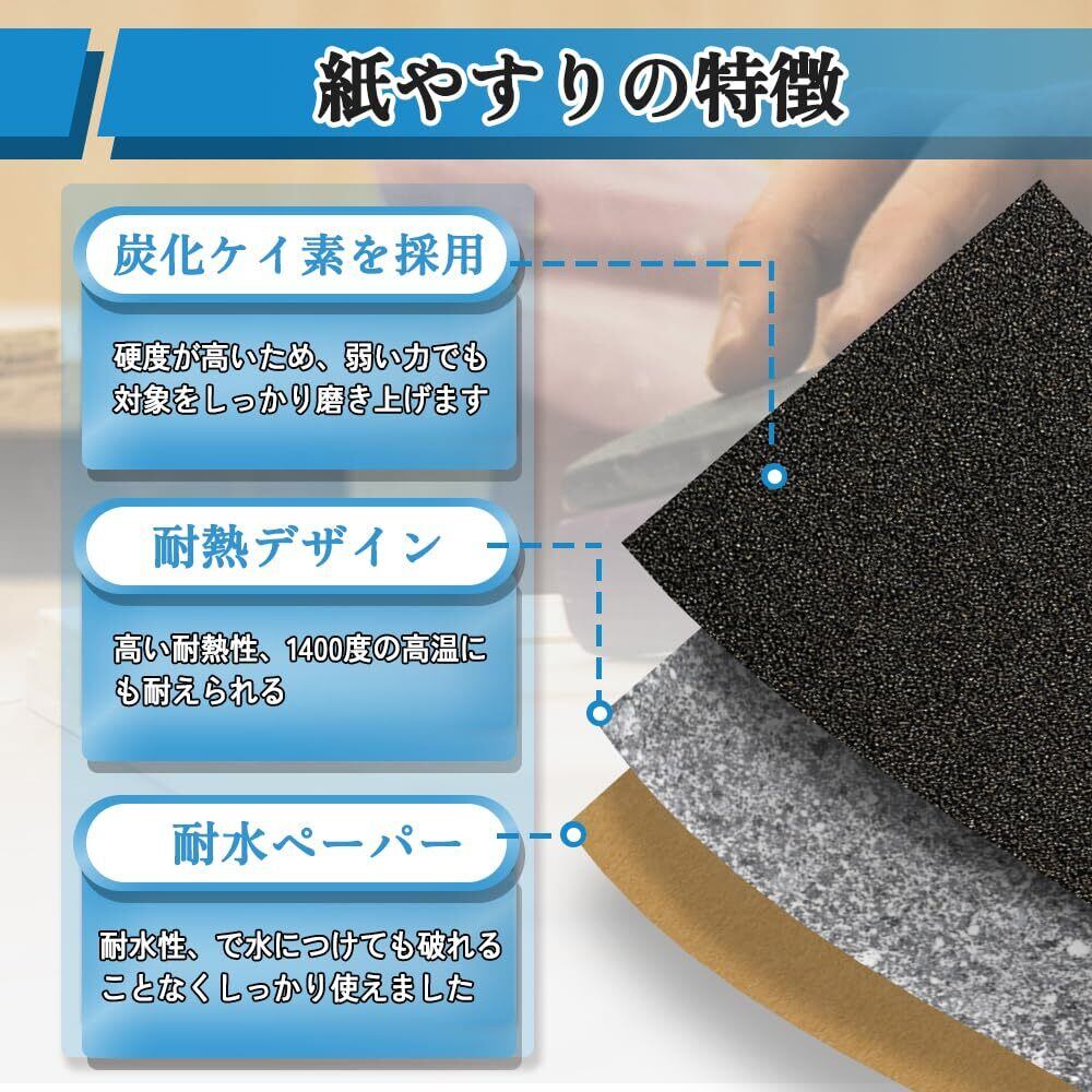 乾湿兼用 耐久性抜群:紙やすりで最新高品質の炭化ケイ素材を使用、硬度が高いで非常に丈夫にできています。耐水ペーパーで高い耐水性があるため、耐水なのでカスも出にくく、水研ぎにも強く使いやすいです。使用後に水洗するとかなりの回数使えます。