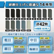 種類が豊富・14種42枚:180番目〜5000番目 紙やすり 耐水ペーパー セット、粗目・中目・細目・極細目セット、180 220 240 320 400 600 800 1000 1200 1500 2000 2500 3000 5000番号(各3枚)長さ230mm×幅93mm 紙ヤスリ。14種類が豊富で便利なセット! 42枚入っているので木工から塗装面の磨きまでなんでも使えそうです!