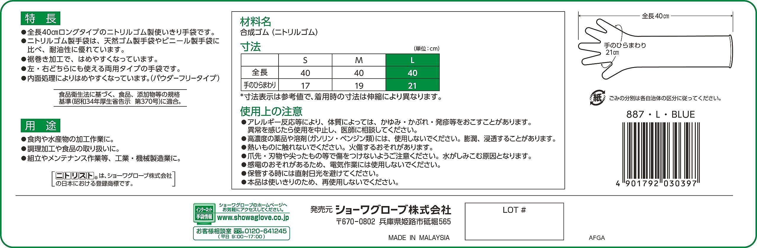 【パウダーフリー】 ショーワグローブ(Showaglove) No.887 ニトリスト・スーパーロング 50枚入 ブルー Lサイズ 1函