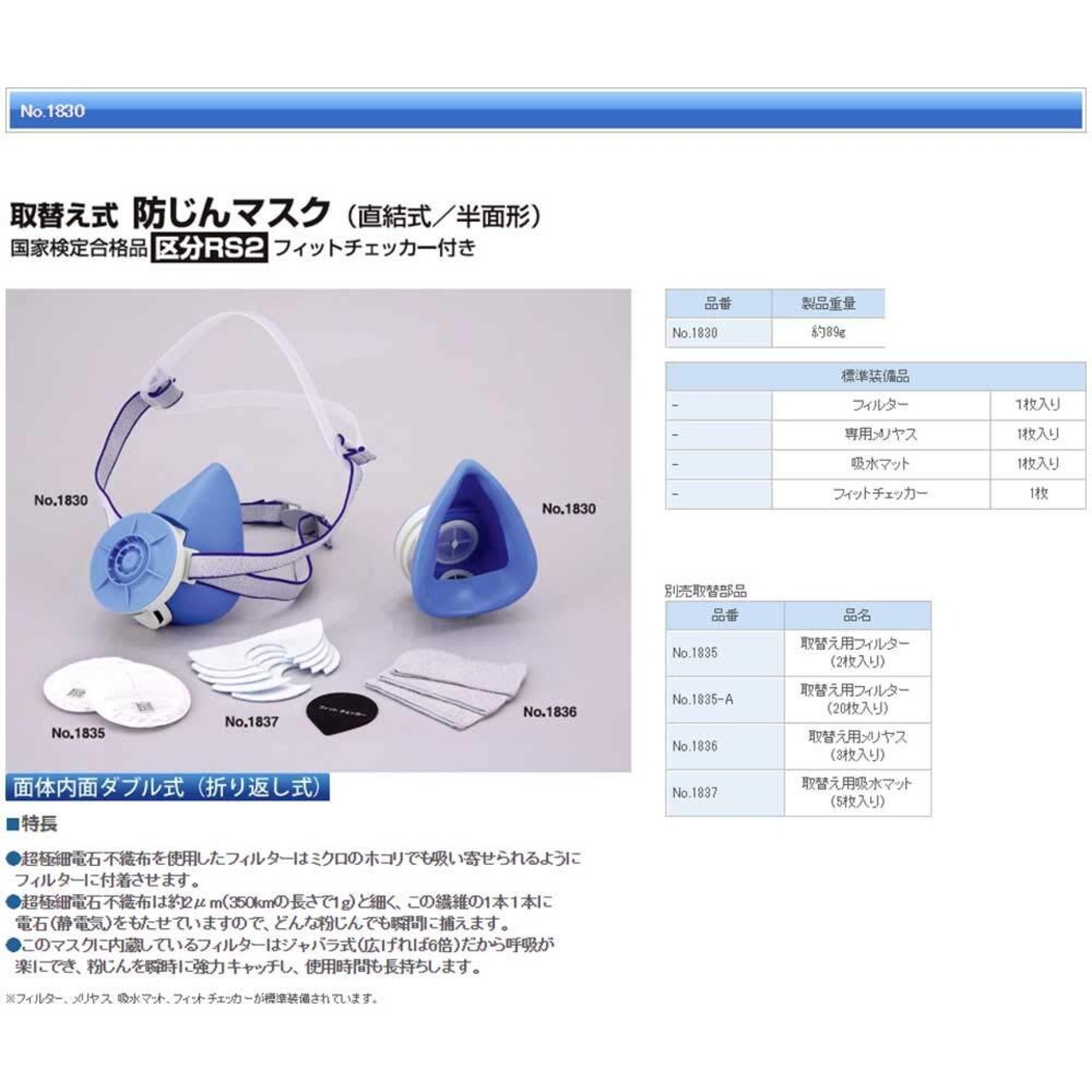 特長 面体内面ダブル式(折返し式)です。 超極細電石不織布を使用したフィルターはミクロのホコリでも吸い寄せられるようにフィルターに付着させます。 用途 溶接作業、研磨作業、一般粉塵作業に。