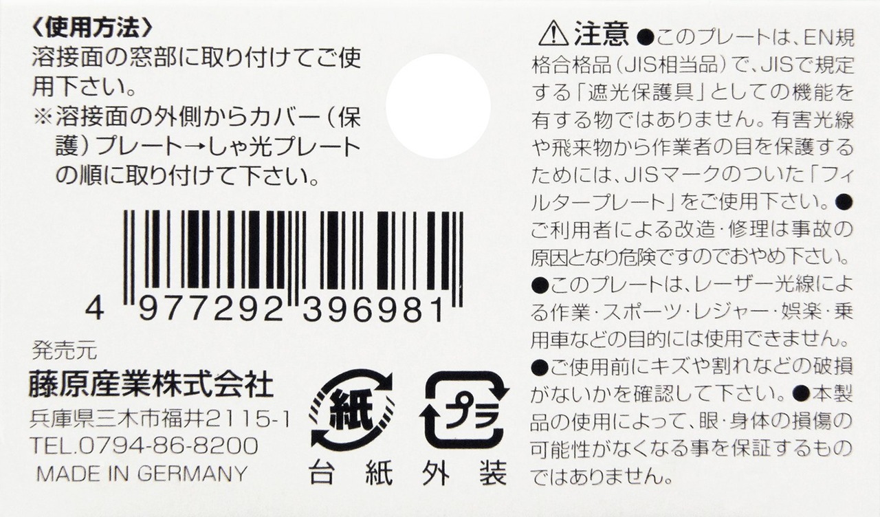 ※このプレートは、EN規格合格品(JIS相当品)で、JISで規定する遮光保護具としての機能を有するものではありません。