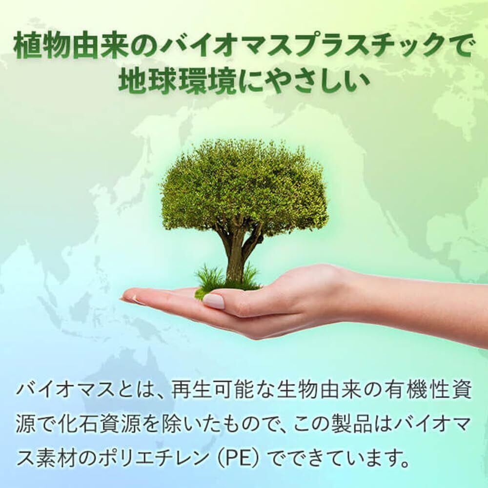 ※バイオマスとは、再生可能な生物由来の有機性資源で化石資源を除いたもので、この製品はバイオマス素材のポリエチレン(PE)で出来ています。