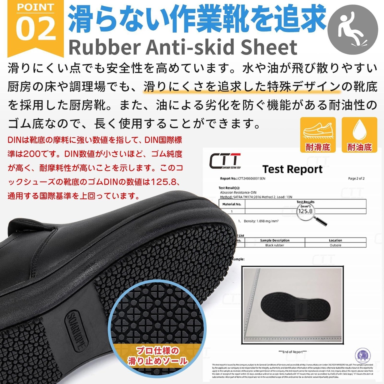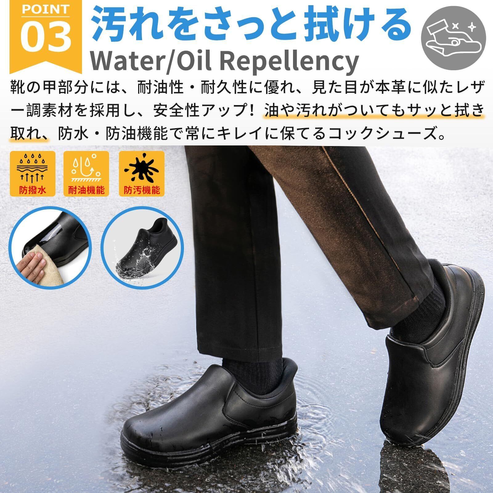 【優れた防水性能】高品質の皮革を使用し、油汚れや水濡れから足をしっかり守ります。厨房やレストランでの水や油の飛び散りにも対応。さらに、柔らかく肌触りが良いため、長時間の着用でも快適です。屈曲性に優れ、亀裂が発生しにくいポリウレタン合皮の甲皮素材は、撥水性と耐油性に優れ、お手入れも簡単です。
