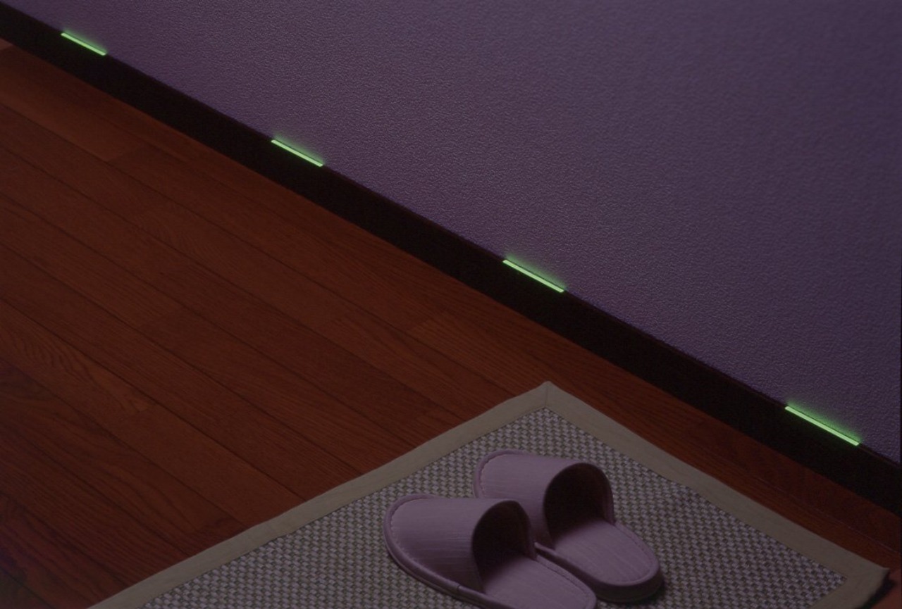 消灯後の明るさ、寿命とも従来品の約10倍。シールタイプなので、はくり紙をはがすだけで簡単に貼れ、夜間や停電時などの目印になる。