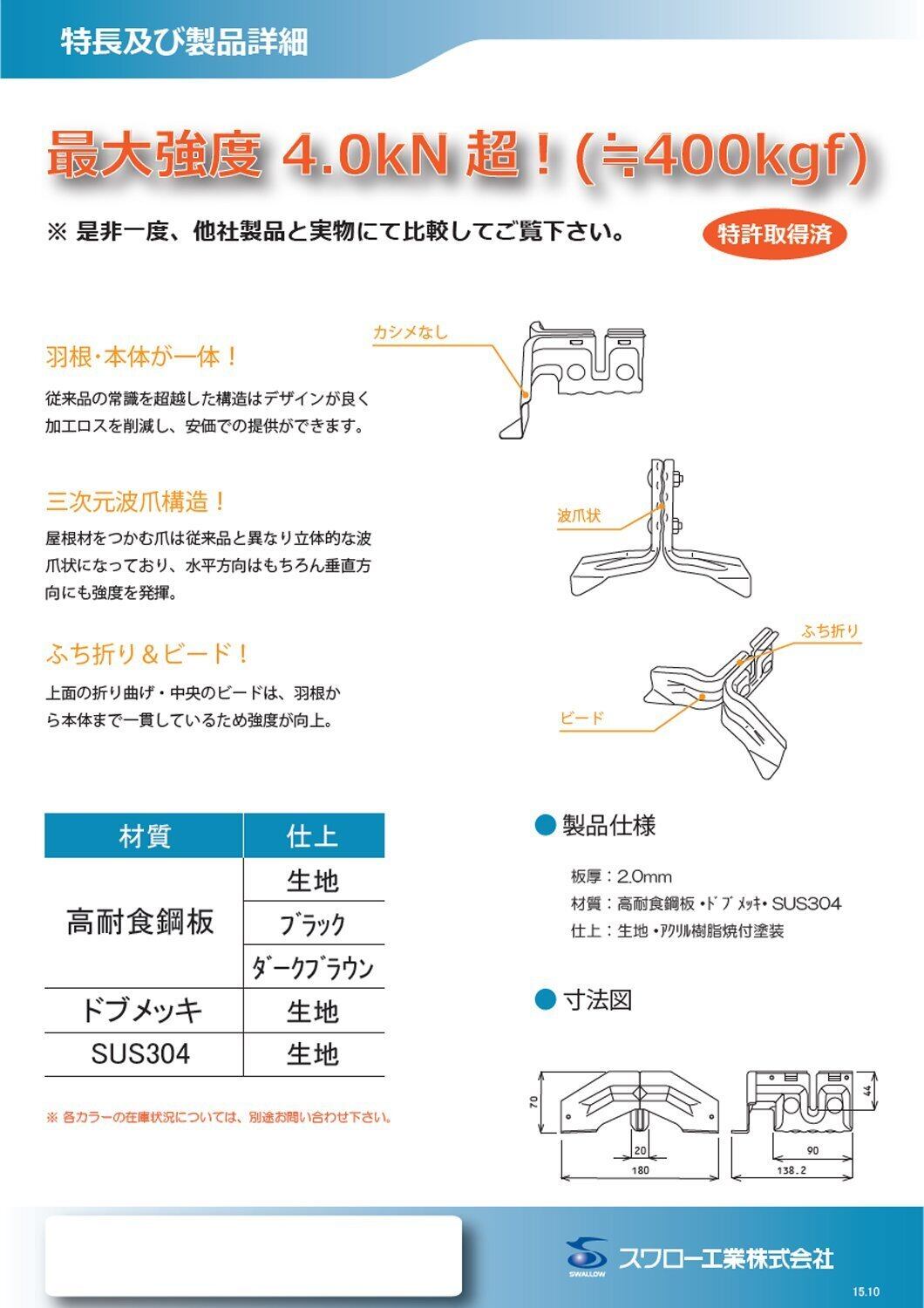 【商品名】 雪止 金具 スワロー工業 ハゼ式立平用 後付 シリウス 羽根 180mm 2本締め ダークブラウン 高耐食鋼板 30入 【商品説明】 屋根関連金具 雪止金具