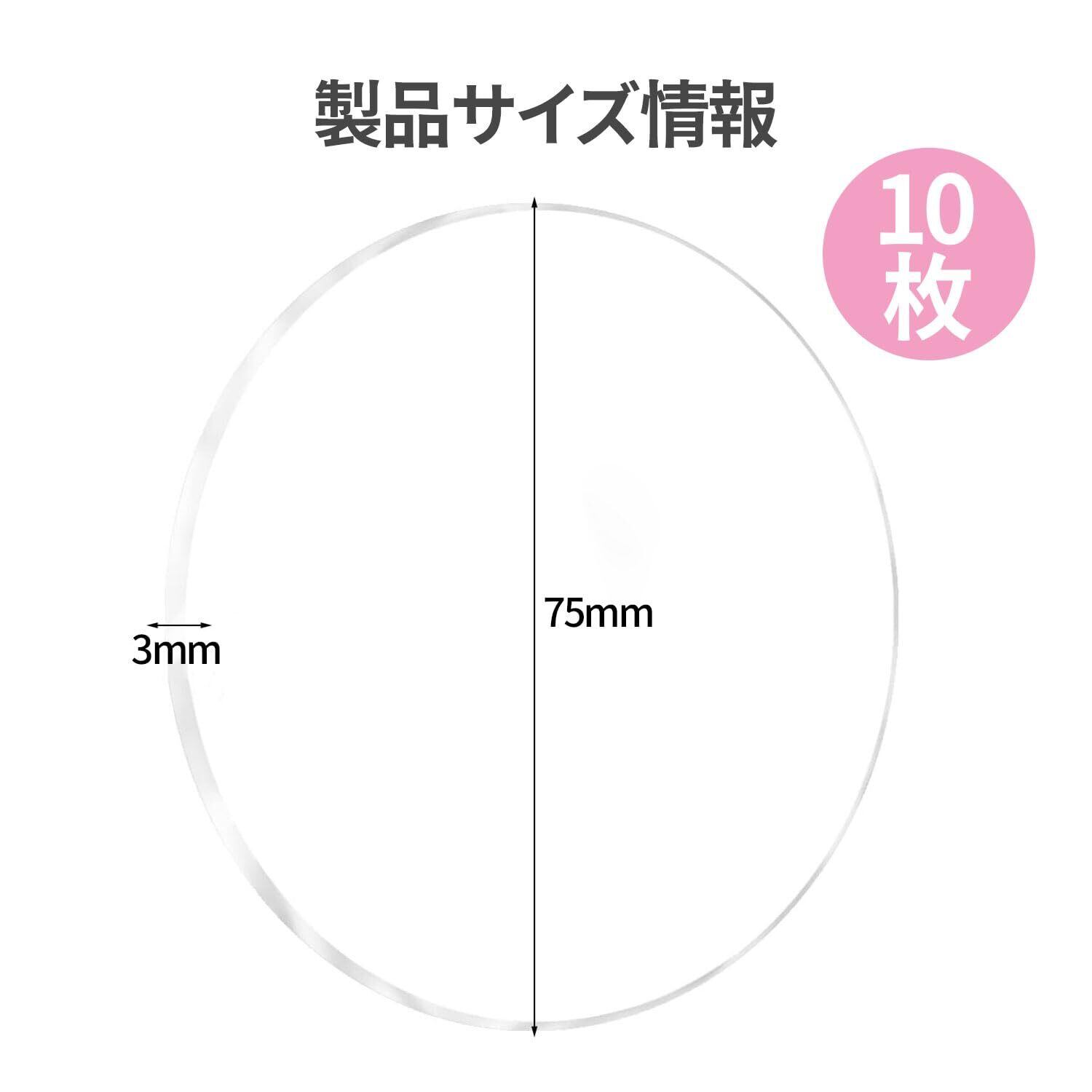【商品仕様】パッケージ内容:丸型アクリル板10枚サイズ:直径約50/75mm、厚さ約3mm。