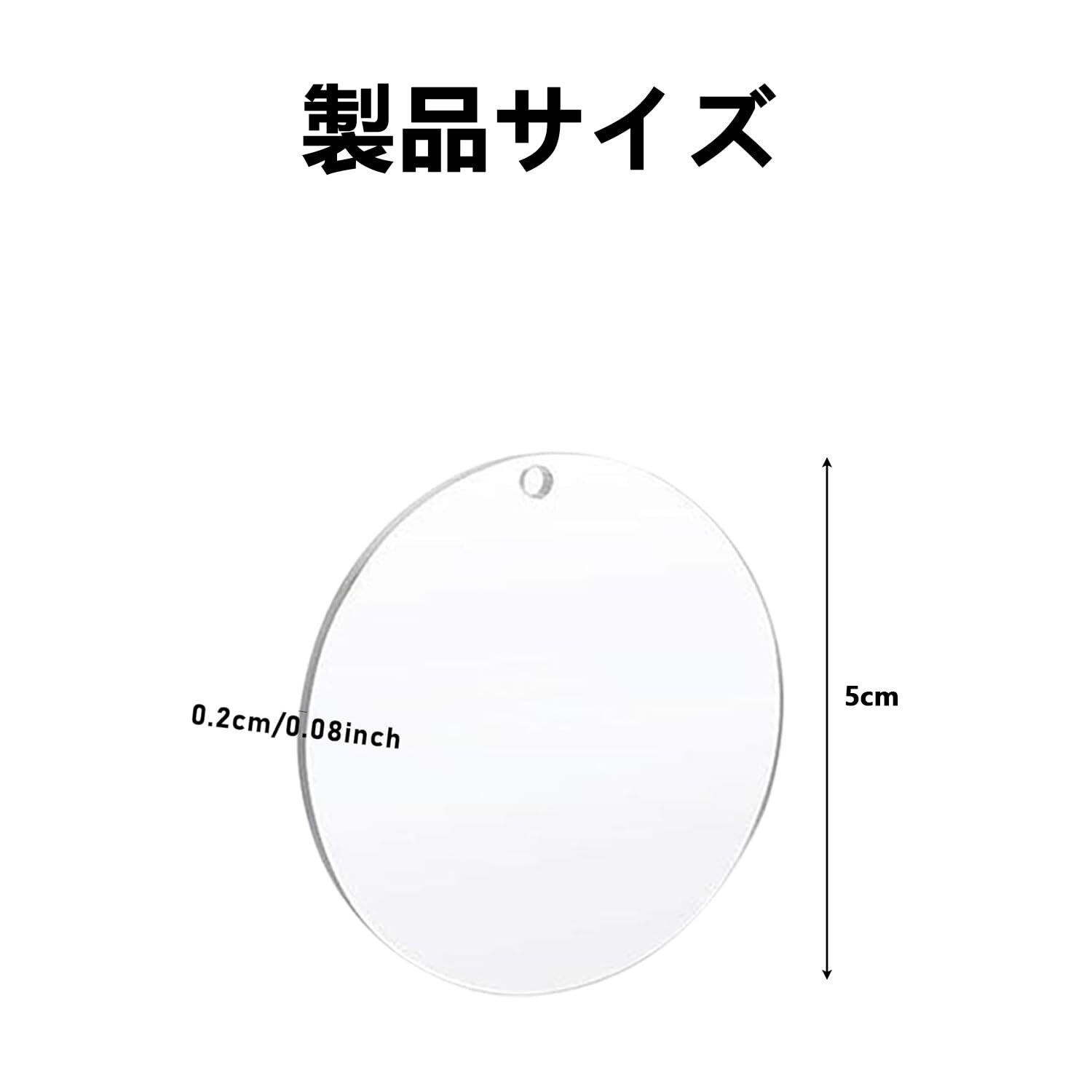 【商品仕様】:数量:丸型アクリル板10枚入り。サイズ:直径約50mm、厚さ2mm。