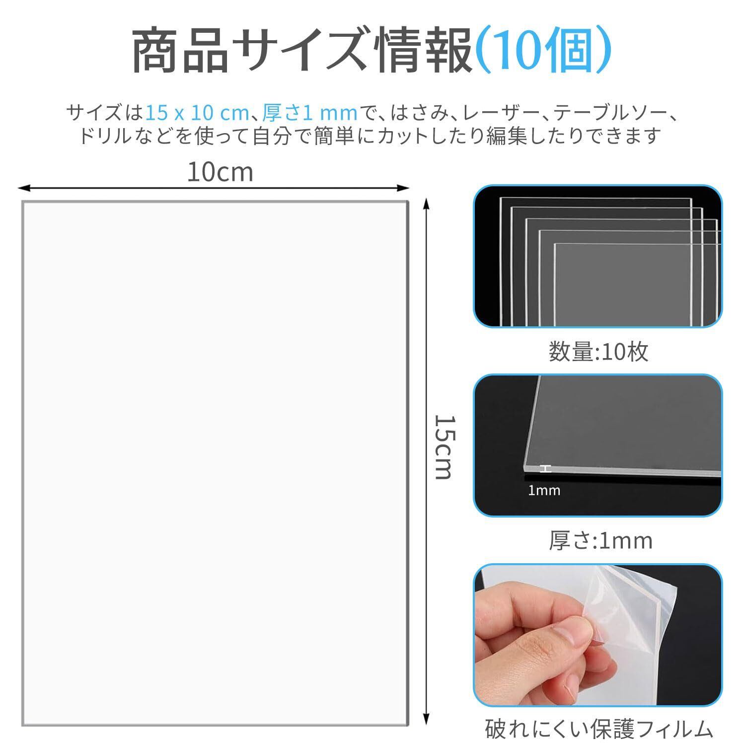 ➡️【商品仕様】透明アクリル板10パック、サイズ150mm×100mm、両面に傷防止保護フィルム付き、使用前に保護フィルムを剥がして、表面が滑らかで完璧であることを確認してください。