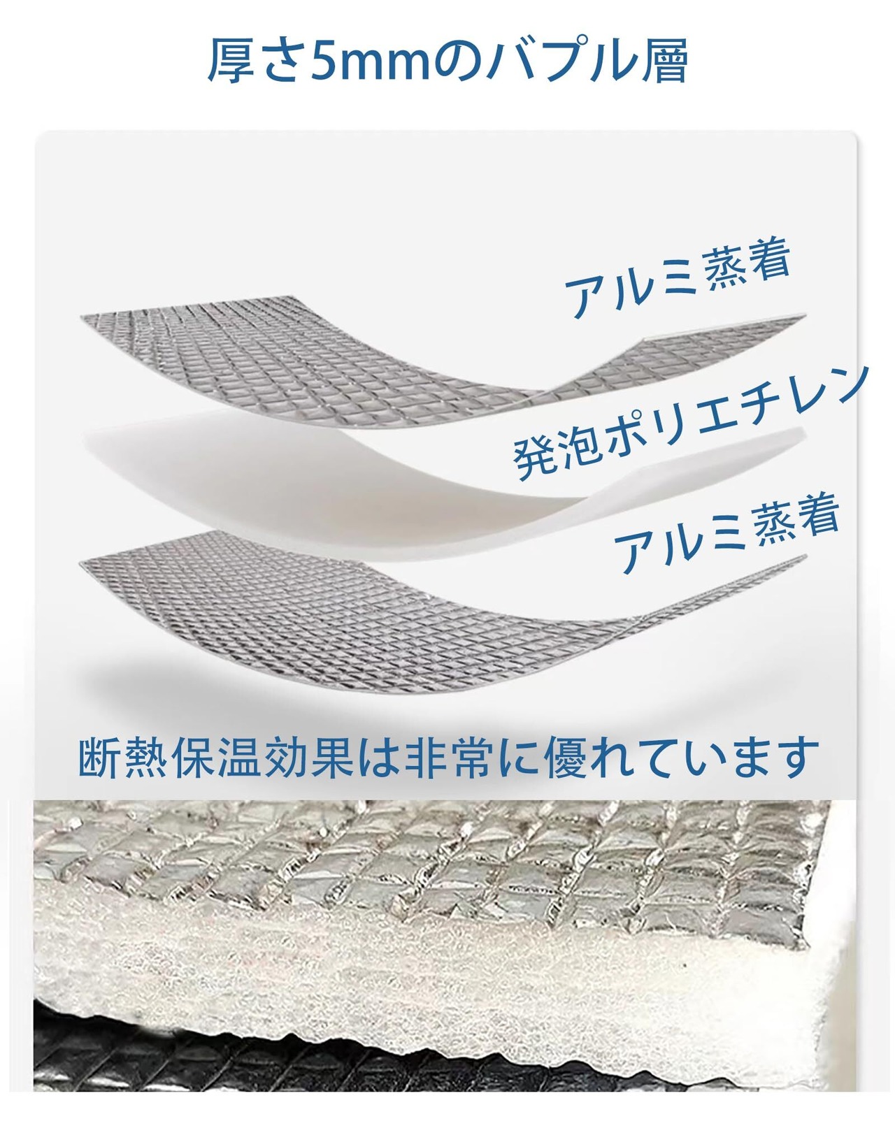 【両面アルミ蒸着】断熱シートの表・裏ともにアルミ蒸着を使用しております、断熱保温効果は非常に優れています。表面のアルミ膜は、紫外線放射と熱伝導を直接反射し、一方、底部のアルミ膜は内側の熱を遮断し、二重の保護を提供しています。これにより、断熱効果が向上します。