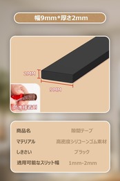 【商品案内】サイズは長さ 6m、幅 9mm、高さ 2mm で、重量は約 120g。高密度シリコーンゴム素材を使用し、耐久性に優れ、ドアや窓の隙間テープ、隙間パッキンとして最適。防音テープとしても機能し、隙間埋めテープとしても活用できます。