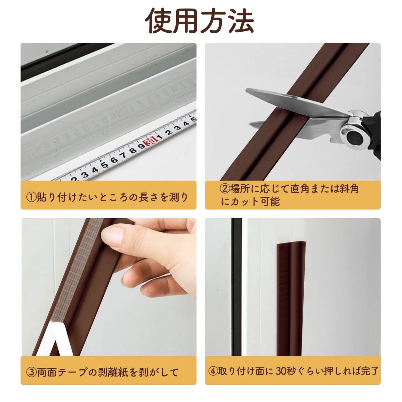 【自己接着性-取り付け簡単】付属の粘着テープも強力なもののため、長持ちする隙間テープです。白い紙を剥がして、取り付ければ完了。※固定位置に30秒くらい押して貼り付けてください。自由にカットできる隙間テープで、必要に応じて適切な長さにカットすることも可能です。