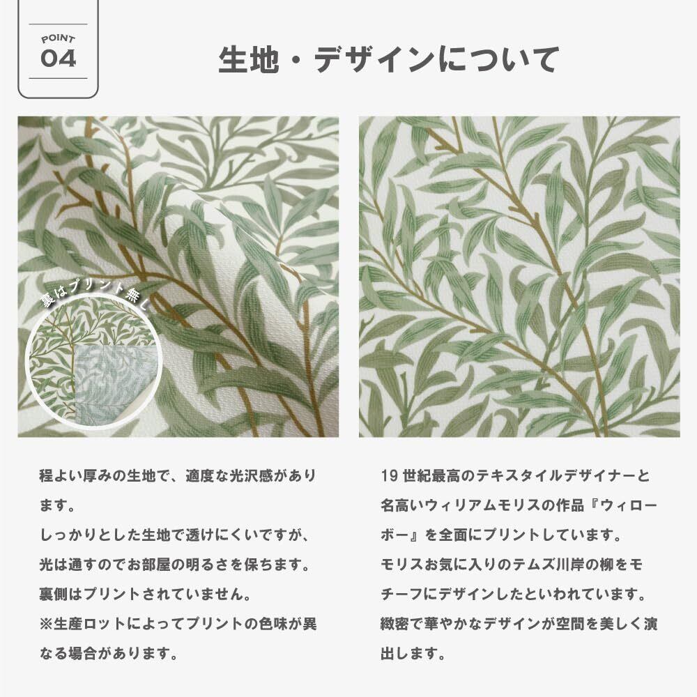 ・1887年に壁紙として、後にプリント生地としても制作されたモリスの最高傑作ともいえるデザイン。<br>・ケルムスコット・マナーのジェインの寝室をはじめ、ゆかりの家々で見ることができます。<br>・モリスお気に入りのテムズ川岸の柳を、自然主義的アプローチから見事な模様に高められたデザインは、今日でも最も愛され続けられています。 <br>※障子レース生地を貼る際、生地の表と裏を間違わない様にしてください。・(※光沢がある面が屋外側になります。)梱包状態のたたみシワが気になる場合はアイロンを掛けてから貼ってください。